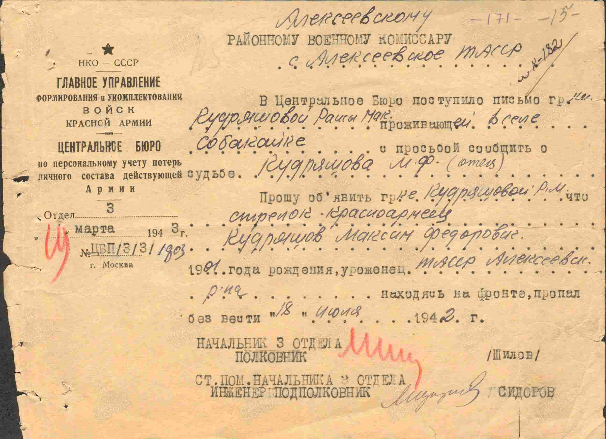 КУДРЯШЁВ Максим Фёдорович, 1901, д. Сабакайка. Мобилизован 23 мая 1942 из ИТК № 2 г. Казань. Кировским РВК. Красноармеец, 691 СП 383 СД 18 А Южного фронта. Учтён пропавшим без вести 18 июля 1942 в боях за г. Боково-Антрацит, Ворошиловградская (Луганская) обл., УкрССР. По данным ГА РТ – попал в плен, освобождён.