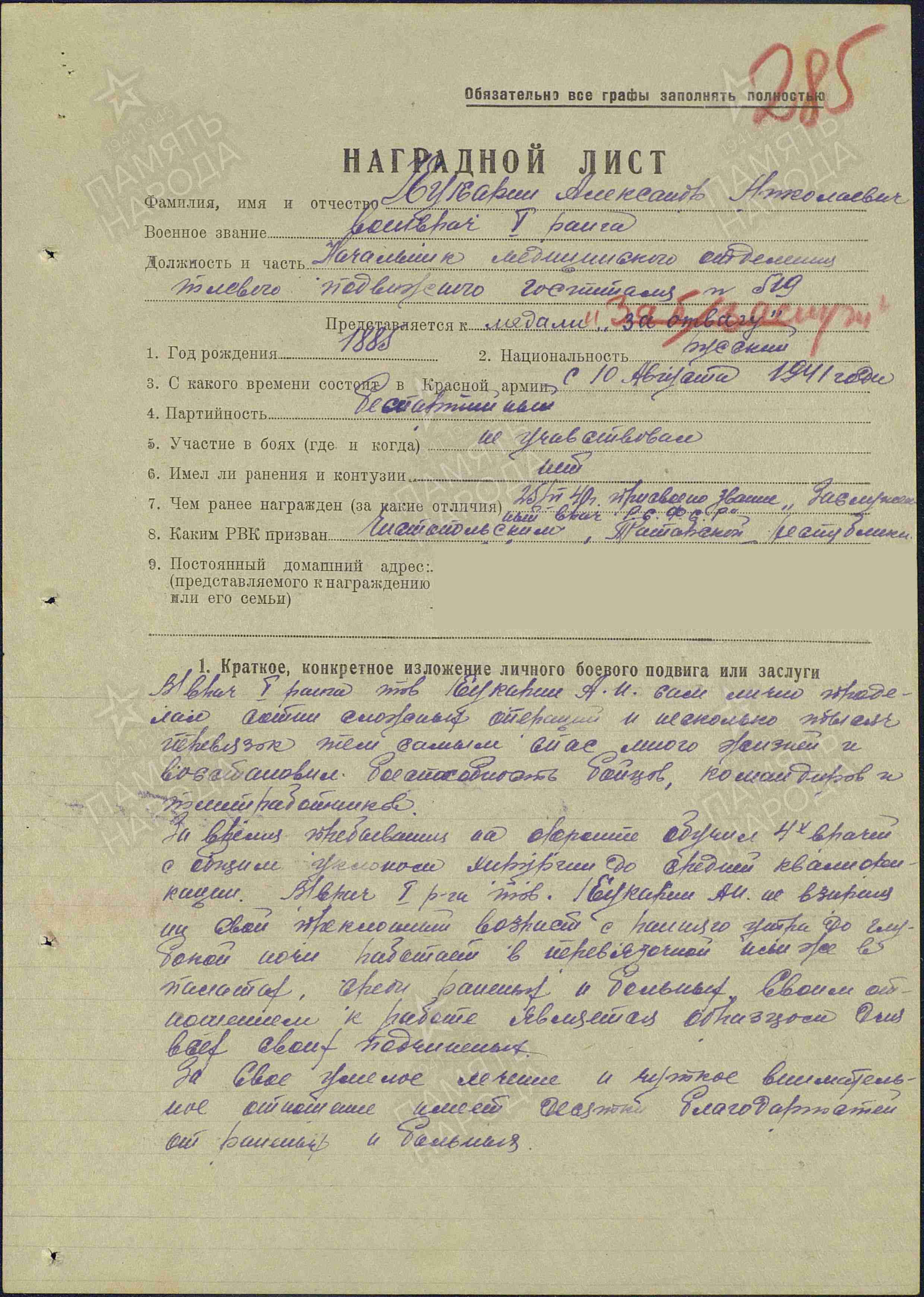 Не смотря на свой преклонный возраст с раннего утра до глубокой ночи работал в перевязочной или же в палатах среди раненных и больных».