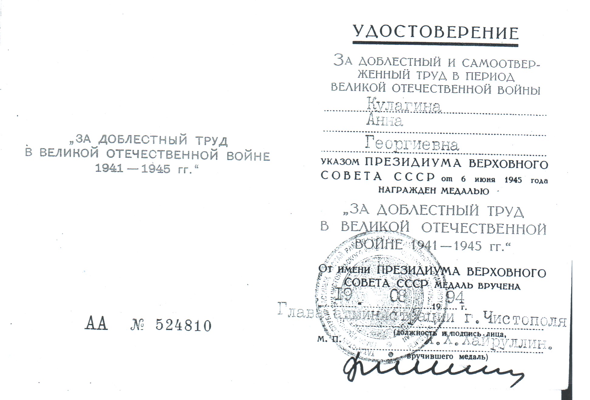 Детство у Анны Георгиевны Кулагиной было украдено. Помнит она и смех и игры и семейные дни рождения,- их детей-то трое. А потом началось такое. о чем до сих пор невозможно говорить без слез, а лучше бы и вовсе это забыть. Началась война. Отца проводили на фронт в октябре 1941. Ей, Анне,- четырнадцать, брату Ивану, -10. Еще шестилетняя сестренка - Настя, да мать, Федосья григорьевна, совсем занедюжила, с постели поднятся не может. Какую же тяжкую ношу пришлось взвалить на свои плечи девчонке-подростку: и домашнее хозяйство вести, и детей воспитывать,и приусадебный участок обрабатывать. Еще и сено косить и за скотиной ходить -какая никакая живность на дворе была. А обстирать, обшить, накормить ребятишек, за матерью больной ухаживать. Как все это выдержать? У тетки, сестры отца, Натальи Ивановны, у самой забот не впроворот. Ладно хоть советы давала.
