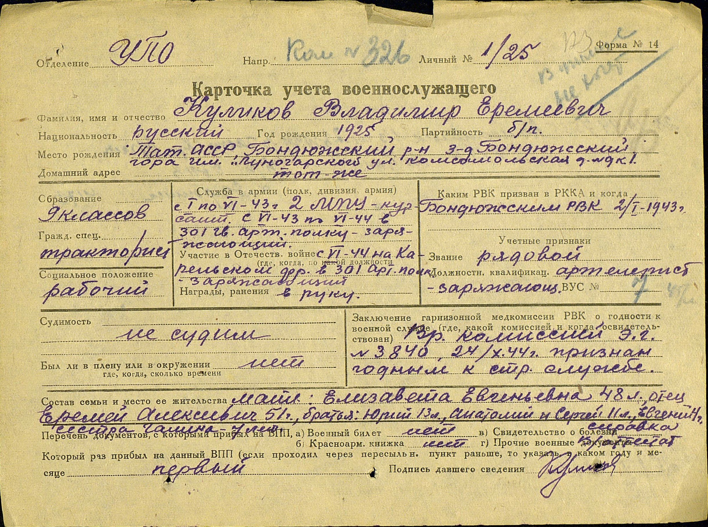 В РККА с 1942 года. Место призыва: Бондюжский РВК, Татарская АССР, Бондюжский р-н.