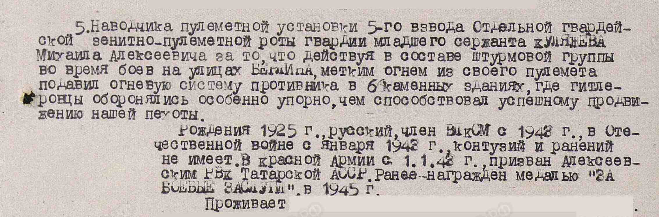КУЛЯЖЕВ Михаил Алексеевич, 1925, д. Бутлеровка. Мобилизован Алексеевским РВК 1 янв. 1943. Воевал на 1 УкрФ. Гв. мл. сержант, наводчик пулемётной установки отд. гв. зенитно-пулемётной роты 48 гв. СД. Принимал участие в освобождении Украины, Польши, боях на территории Восточной Пруссии и штурме Берлина. Награждён медалями "За боевые заслуги" дважды, "За взятие Берлина", орденом Отечественной войны 2 ст. (1985).