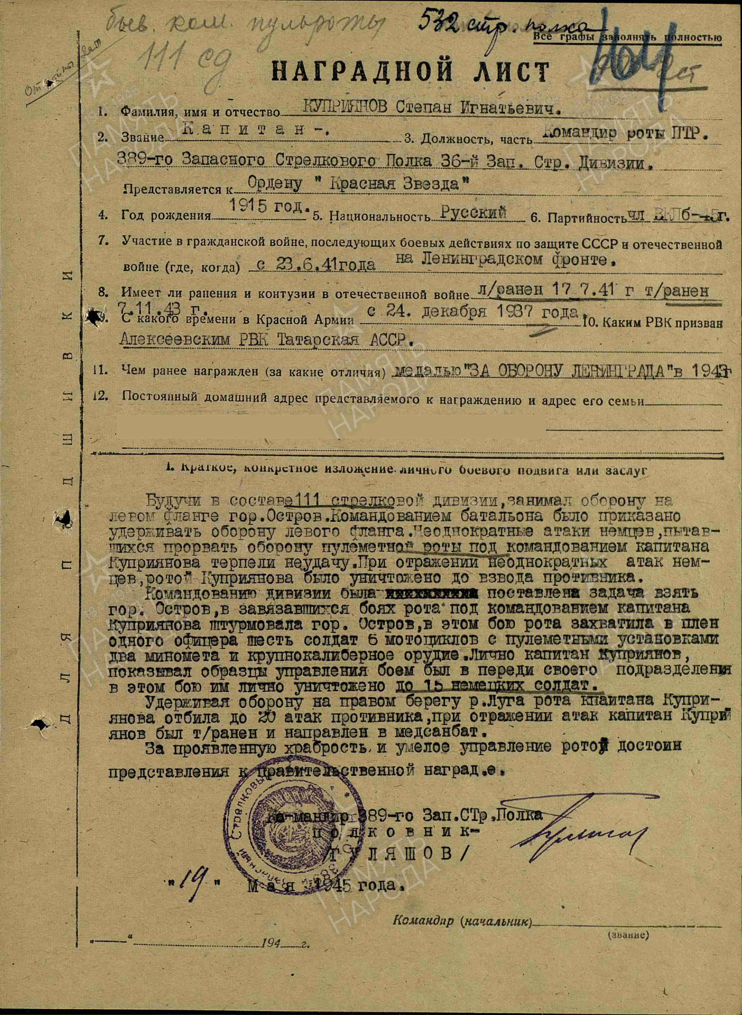 КУПРИЯНОВ Степан Игнатьевич, 1915, с. Балахчино. Член ВЛКСМ с 1934. Призван 9 окт. 1937 Алексеевским РВК. В 1939 окончил Ленинградское пехотное командное училище. Мл. лейтенант. В боях с 23 июня 1941 на Ленинградском направлении. Легко ранен 8 июля 1941 в боях за г. Остров, Псковская обл. Проходил лечение в ЭГ 1184, г. Вологда. 11 авг. 1941 направлен в 13 отд. пулемётно-артиллерийский батальон Ленинградского ополчения Лужской оперативной группы Северного фронта. Также воевал ком. пулемётной роты в составе 532 СП 111 СД 11 Северо-Западного/ Ленинградского фронта, 52 А Волховского фронта, лейтенант. Тяжело ранен 7 нояб. 1943. После излечения служил ком. роты ПТР 389 зап. СП 36 зап. СД, капитан. Член ВКП(б) с 1945. Награждён медалью «За оборону Ленинграда», орденом Отечественной войны 2 ст. (1945). Вышел в отставку 22 сент. 1954.