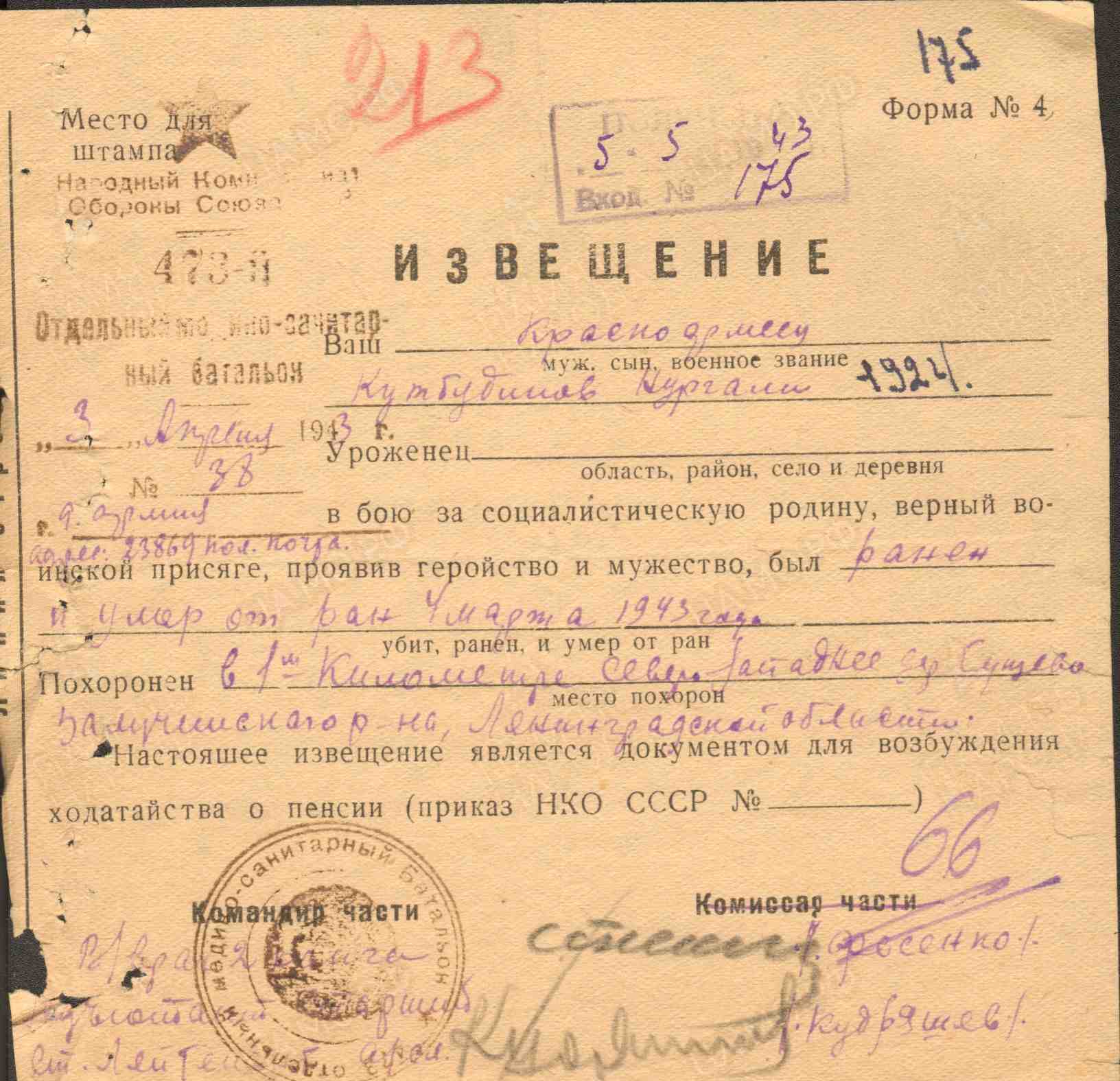 КУТБУТДИНОВ Нургали Нургаязович, 1923, с. Большие Тиганы. Мобилизован Билярским РВК в 1942. Красноармеец, стрелок 1278 СП 391 СД 1 УдА Северо-Западного фронта. Умер от ран (слепое осколочное) 4 марта 1943 в 473 отд. МСБ, д. Сущево, Залучский (Шимский) р-н, Новгородская обл.