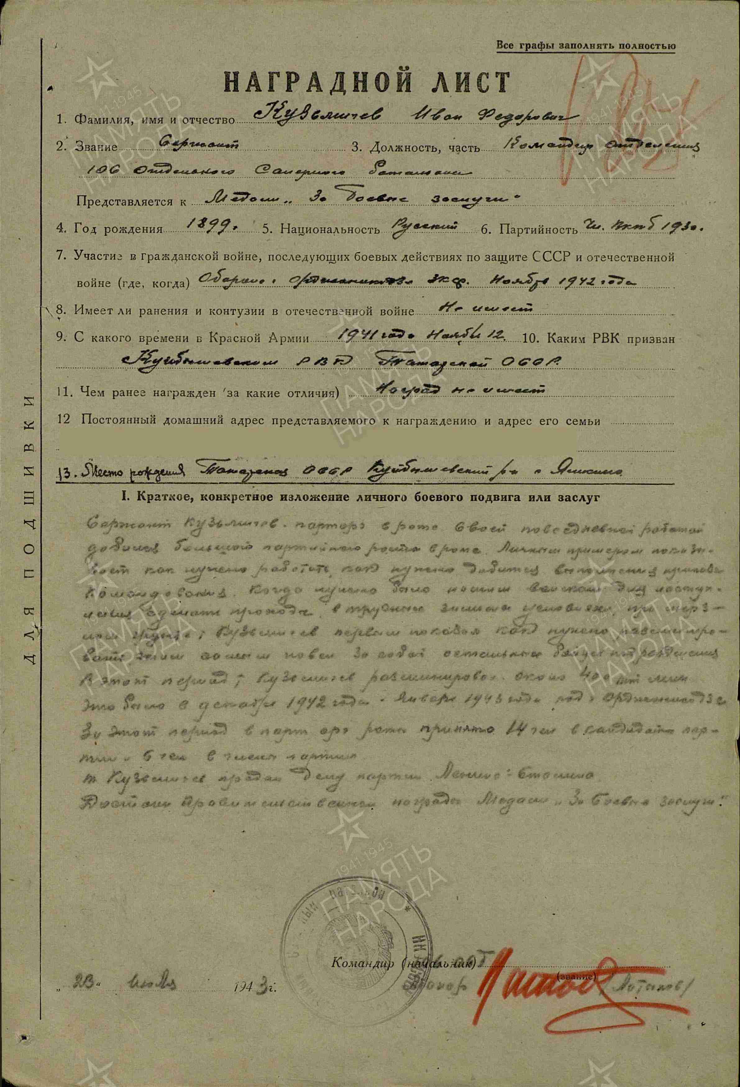 КУЗЬМИЧЁВ Иван Фёдорович, 1899, д. Ямкино. Мобилизован 12 нояб. 1941 Куйбышевским РВК. Сержант. Член ВКП(б). В боях с нояб. 1942 на Закавказском, Воронежском фронтах. Ком. отделения, парторг роты 106 отд. сапёрного батальона 27 А. Награждён медалью «За боевые заслуги». 21 авг. 1943 попал в плен под г. Ахтырка. Освобождён через 22 месяца войсками 1 гв. А 4 Украинского фронта. Через сборно-пересыльный пункт № 74 направлен в 113 армейский запасной СП. После демобилизации жил в с. Три Озера.