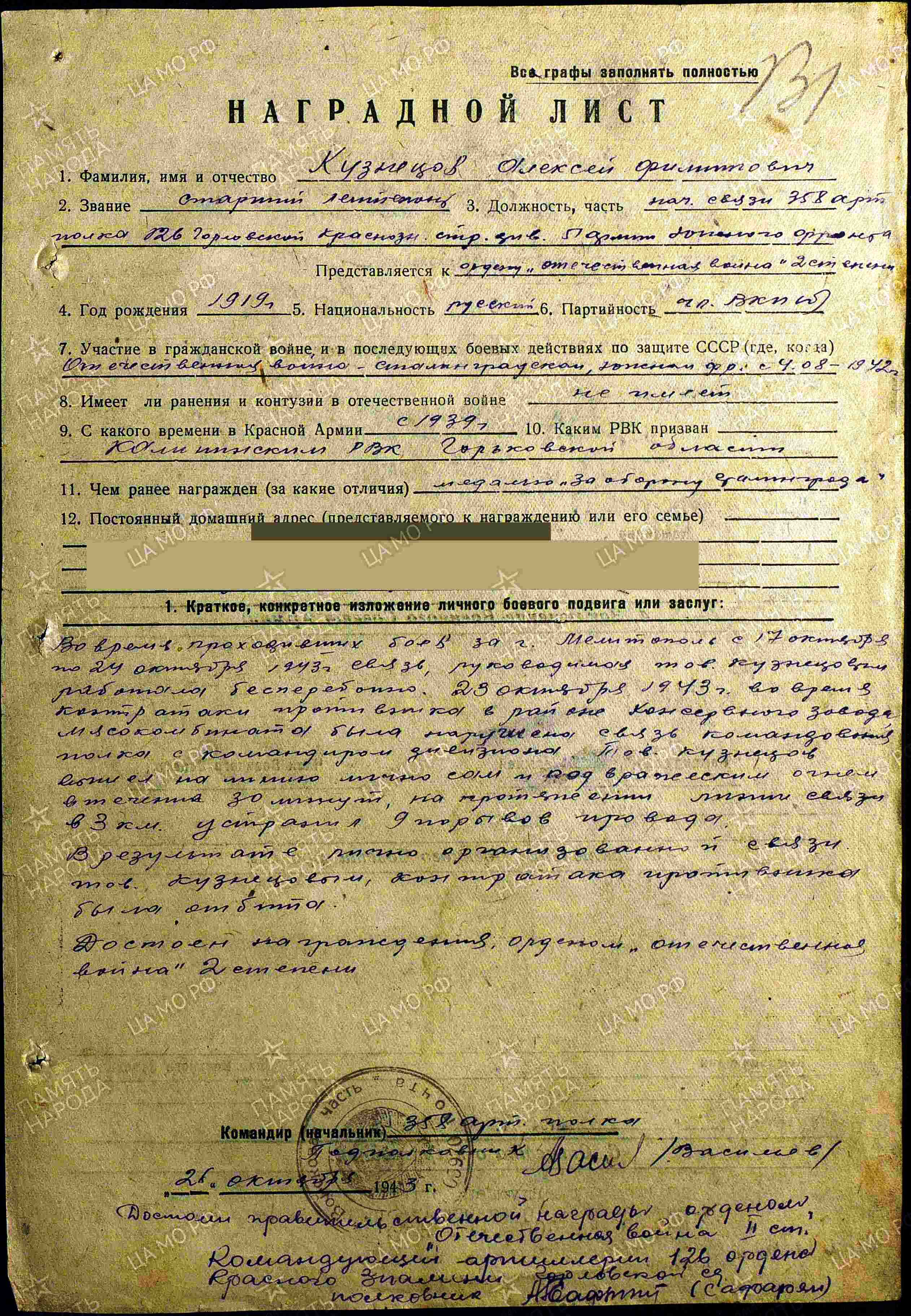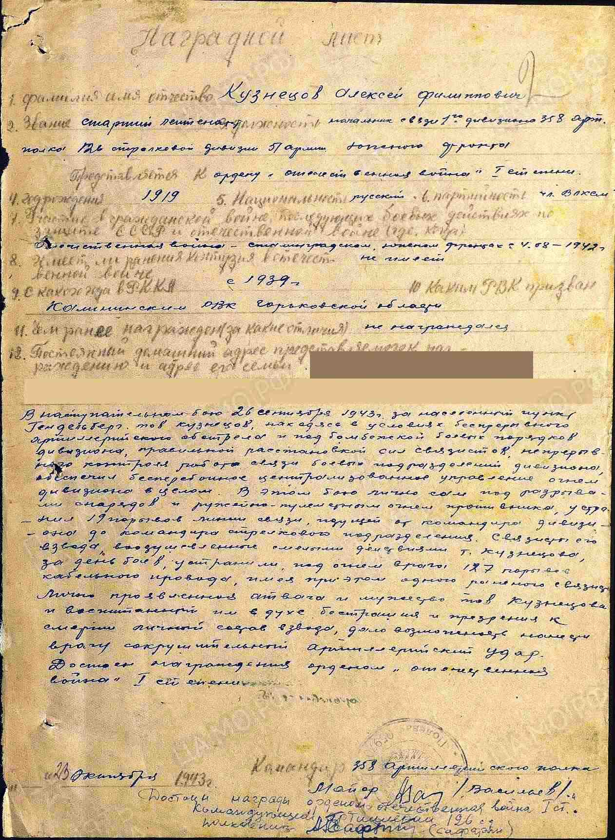 КУЗНЕЦОВ Алексей Филиппович, 1919, д. Старое Муллино. Призван в РККА в 1939 Калининским (Дзержинским) РВК Горьковской обл. Служил в артиллерии на Дальнем Востоке, мл. сержант, награждён знаком "Отличник РККА". Окончил военное училище. Воевал с 4 авг. 1942 на Сталинградском, Южном, 4 Украинском, 1 Прибалтийском, 3 и 2 Белорусском фронте в составе 64 А/ 51 А/ 5 УдА/ 2 гв. А/ 43 А/ 39 А. Перенёс одно ранение. Член ВЛКСМ\ ВКП(б). Ст. лейтенант/ капитан, нач. связи дивизиона 358 АП 126 СД. Участник обороны Сталинграда, освобождения Украины, Крыма, Прибалтики, боёв в Вост. Пруссии. Неоднократно лично выходил на устранение порывов линии связи под обстрелом противника, в ходе боёв и в особо критические моменты боевой обстановки обеспечивал со своими подчинёнными связистами чёткую связь своего дивизиона с командным пунктом полка. Награждён медалями «За оборону Сталинграда», «За взятие Кенигсберга», орденом Красной Звезды (1944), двумя орденами Отечественной войны 2 ст. (1943, 1945), двумя орденами Отечественной войны 1 ст. (1943, 1985). Уволен в запас 11 мая 1946.