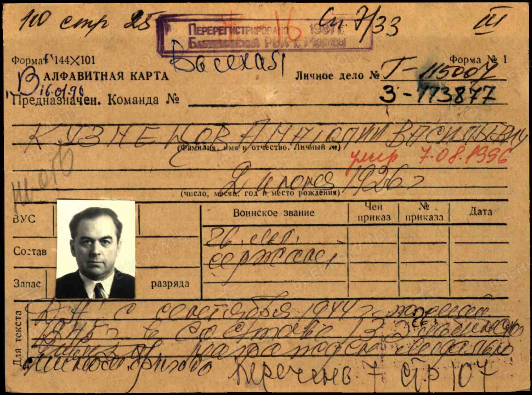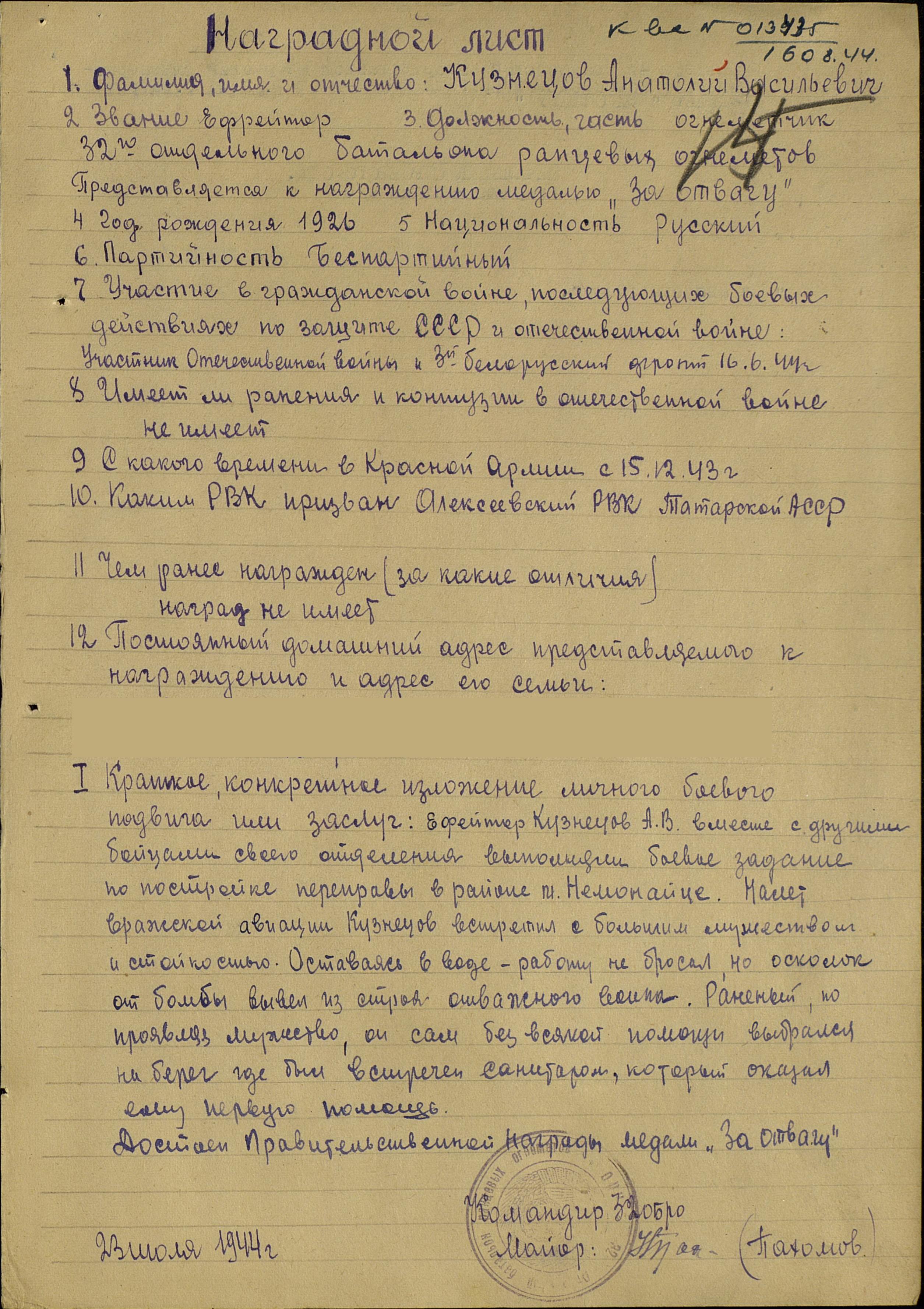 КУЗНЕЦОВ Анатолий Васильевич, 1926, г. Москва. С 1941 - в эвакуации. Работал на з-де "Сухое молоко". Мобилизован Алексеевским РВК 5/9 нояб. 1943. Член ВЛКСМ. Ефрейтор, огнемётчик 32 отд. батальона ранцевых огнемётов 2 гв. моторизованной штурмовой инж. сапёрной бригады 11 гв. А 3 Белорусского фронта. Участник освобождения Белоруссии. Тяжело ранен осколком авиабомбы при постройке переправы в июле 1944. Проходил лечение в ЭГ 1072, г. Москва. В сент. 1944 направлен в 13 гв. МинБр. Демобилизован 31 авг. 1944 в звании "гв. мл. сержант". Награждён медалью "За отвагу", орденом Отечественной войны 1 ст. (1985). Умер в 1996.