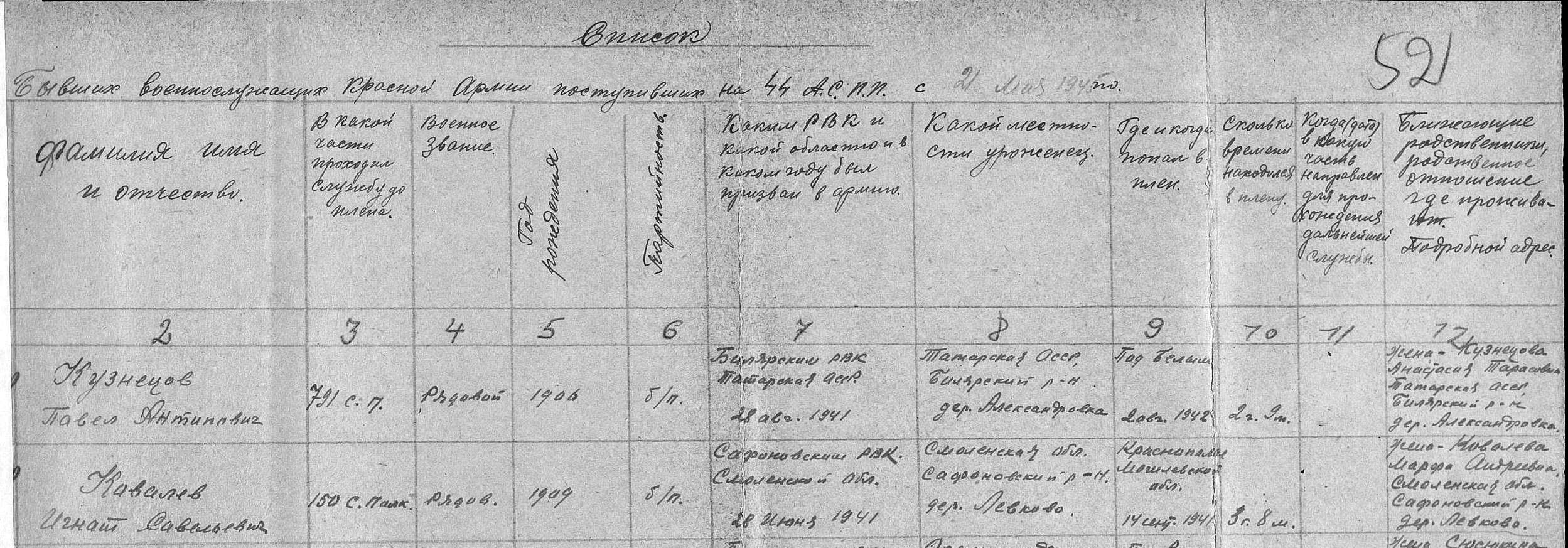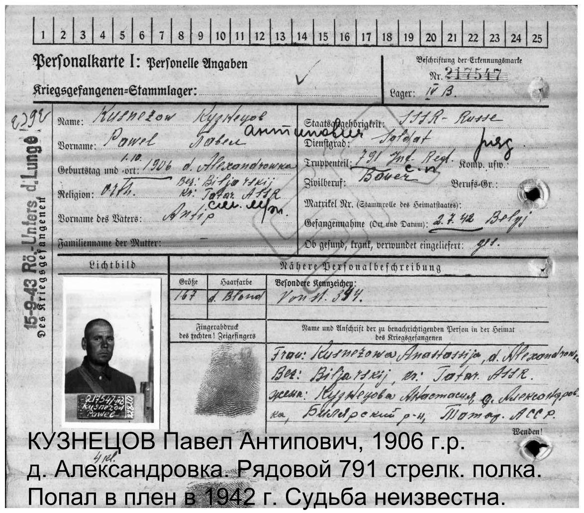 КУЗНЕЦОВ Павел Антипович, 1906, Татарская АССР, Билярский р-н, д. Александровка. Мобилизован Билярским РВК 28 августа 1941 г. Красноармеец 791 СП 135 СД. Попал в плен 2 июля 1942г. Смоленская обл., Бельский р-н, д. Бондарево, п. Ольшаники (Егорьевский с/с, д. Егорьево).. Содержался в лагере IV B, г. Мюльберг. Находился в плену 2 года и 9 месяцев. Был освобождён в апреле 1945 г.