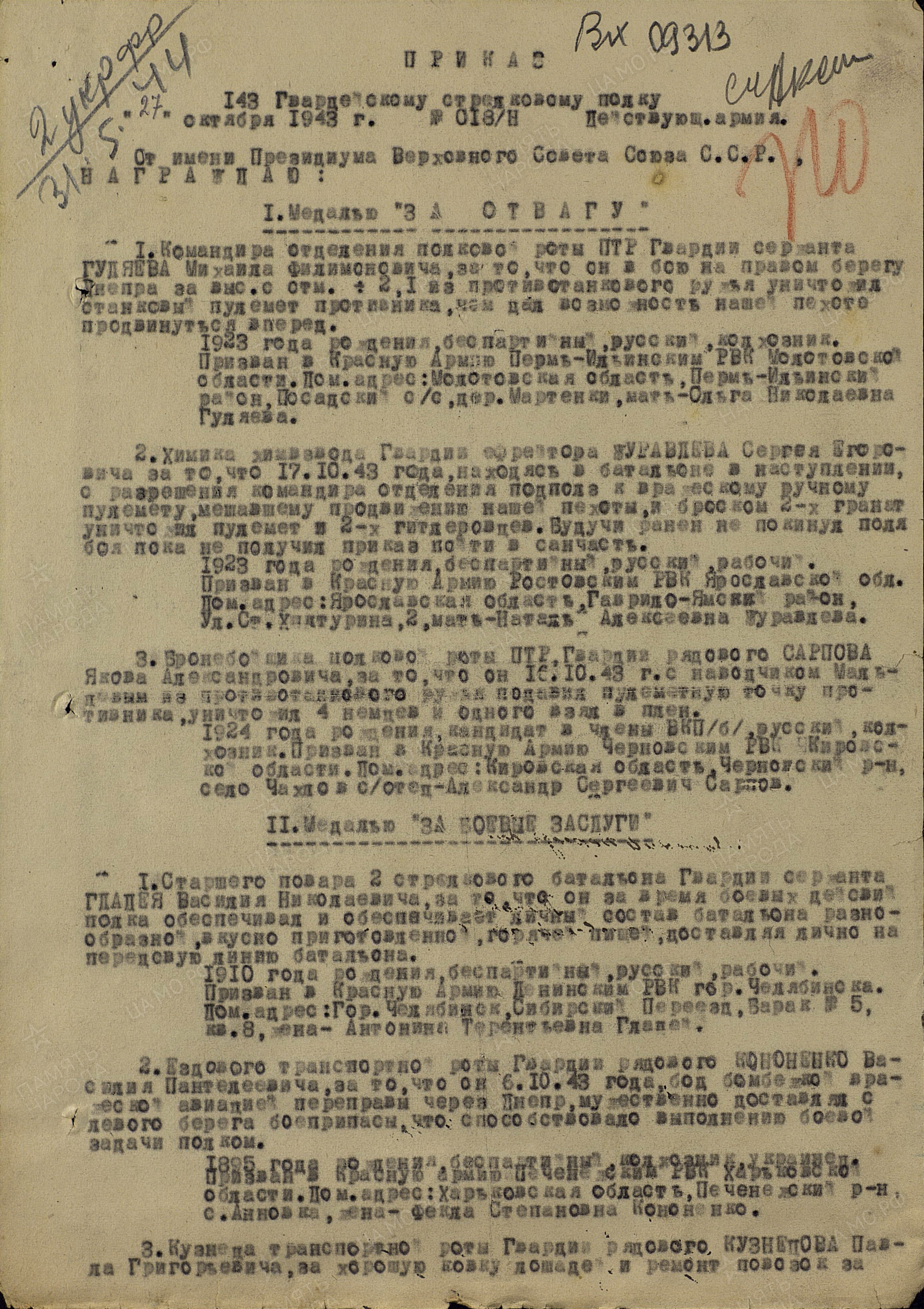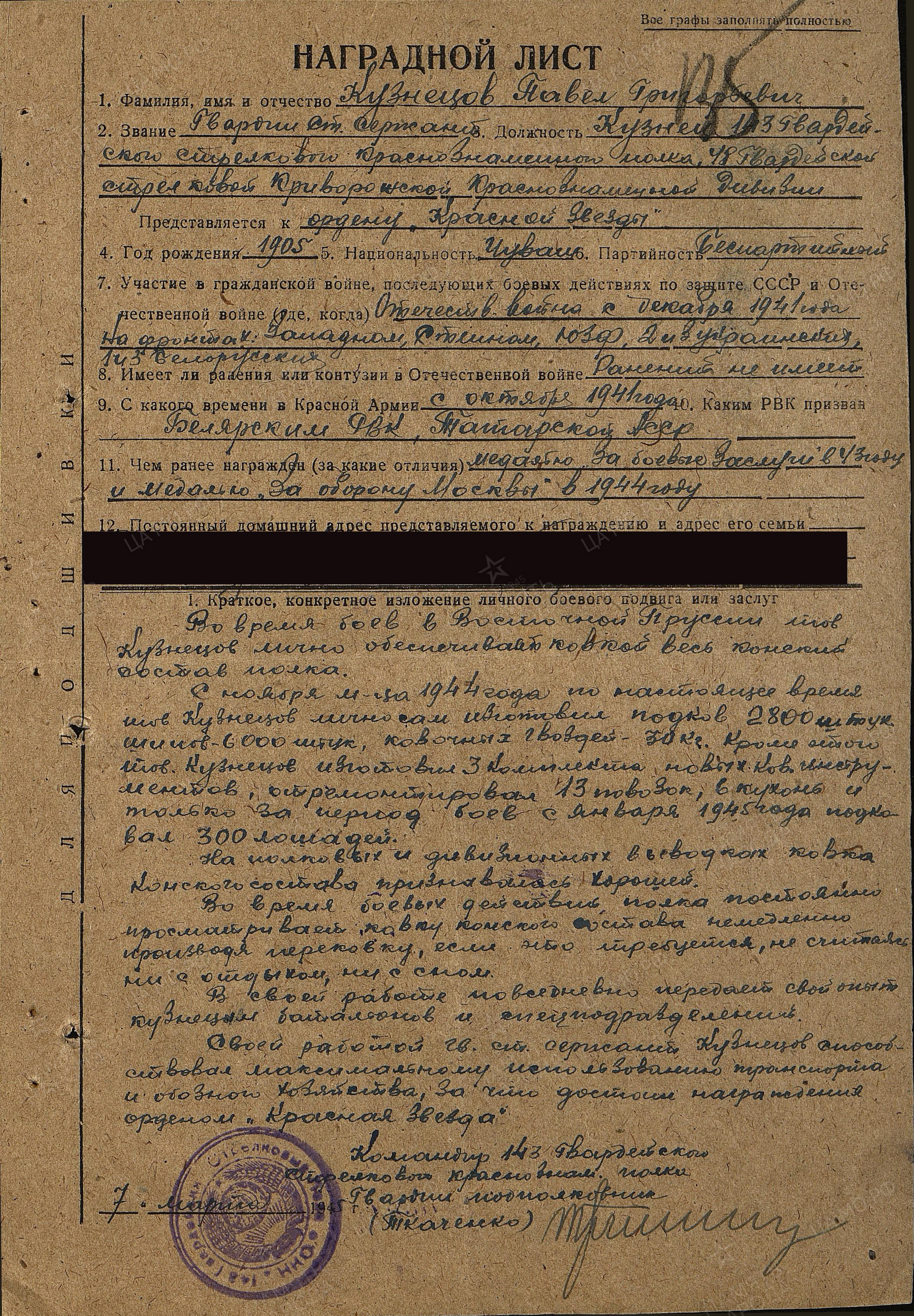 КУЗНЕЦОВ Павел Григорьевич, 1905, с. Чувашская Майна. Мобилизован Билярским РВК 21 окт. 1941. Воевал на Западном, Степном, Юго-Западном, 2 и 3 Украинском, 3 и 1 Белорусском фронтах. Полковой кузнец, гв. ст. сержант 143 гв. СП 48 гв. СД. Награждён медалями "За боевые заслуги", "За оборону Москвы", "За взятие Берлина", орденом Красной Звезды.