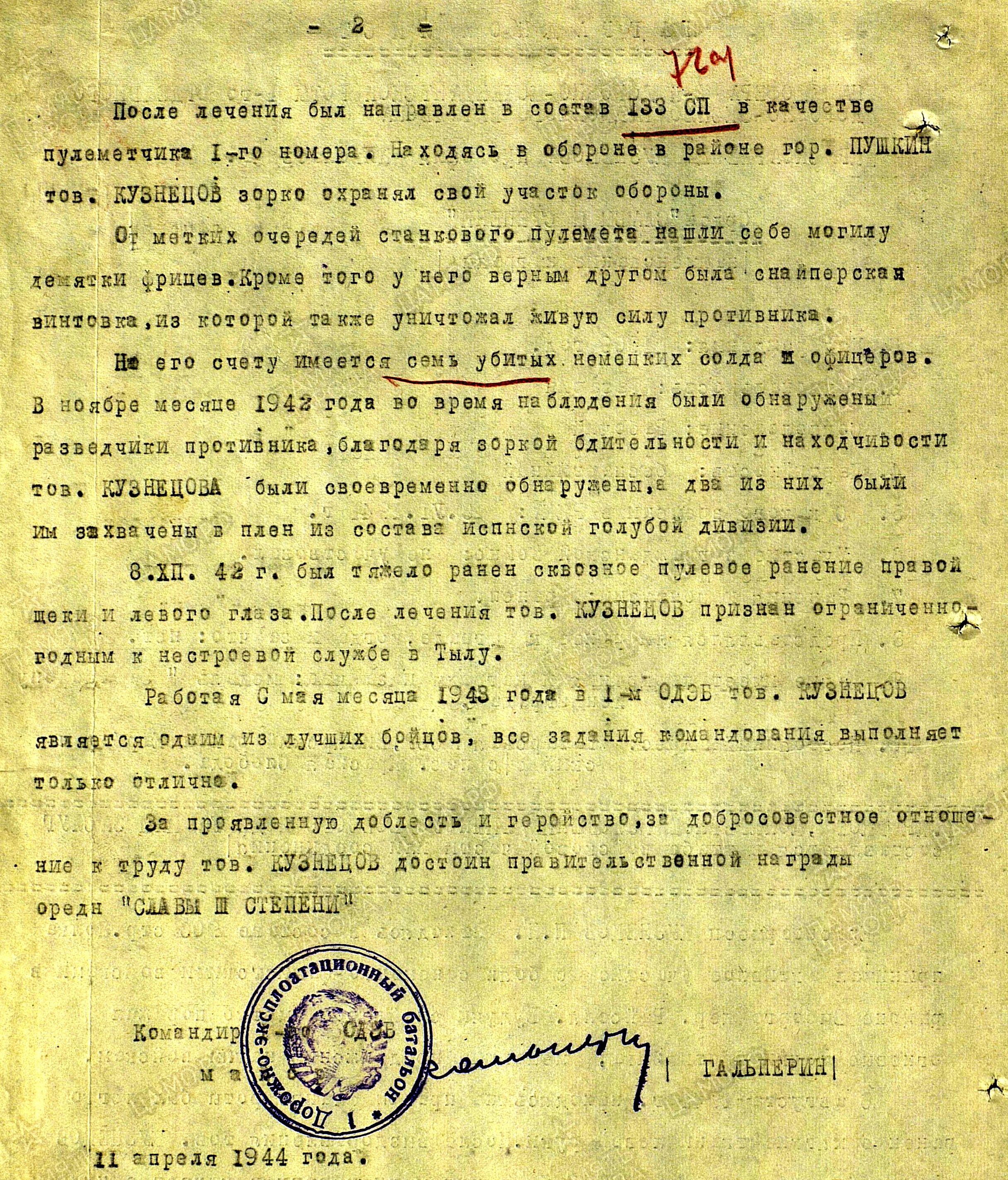 КУЗНЕЦОВ Прокофий Николаевич, 1909, с. Крещёный Баран. Мобилизован Билярским РВК 23 июня 1941. Красноармеец. Стрелок, пулемётчик 72 СД ЛенФ. 6 авг. 1941 легко ранен на Выборгском направлении. 12 нояб. 1941 при наступлении на г. Колпино тяжело ранен осколком мины в голову, получил сотрясение мозга и паралич правой ноги. После излечения воевал в составе 133 СП 72 СД. В боях за г. Пушкин уничтожил семь немецких солдат. Будучи в дозоре обнаружил группу вражеских разведчиков из состава испанской «голубой» дивизии, двое из которых были захвачены в плен. 8 дек. 1942 получил сквозное пулевое ранение правой щеки и левого глаза. После излечения признан ограниченно годным к службе в тылу. С мая 1943 – шофёр 2 дорожно-комендантской роты 1 отд. дорожно-эксплуатационного батальона. Награждён орденом Славы 3 ст., медалью «За оборону Ленинграда».