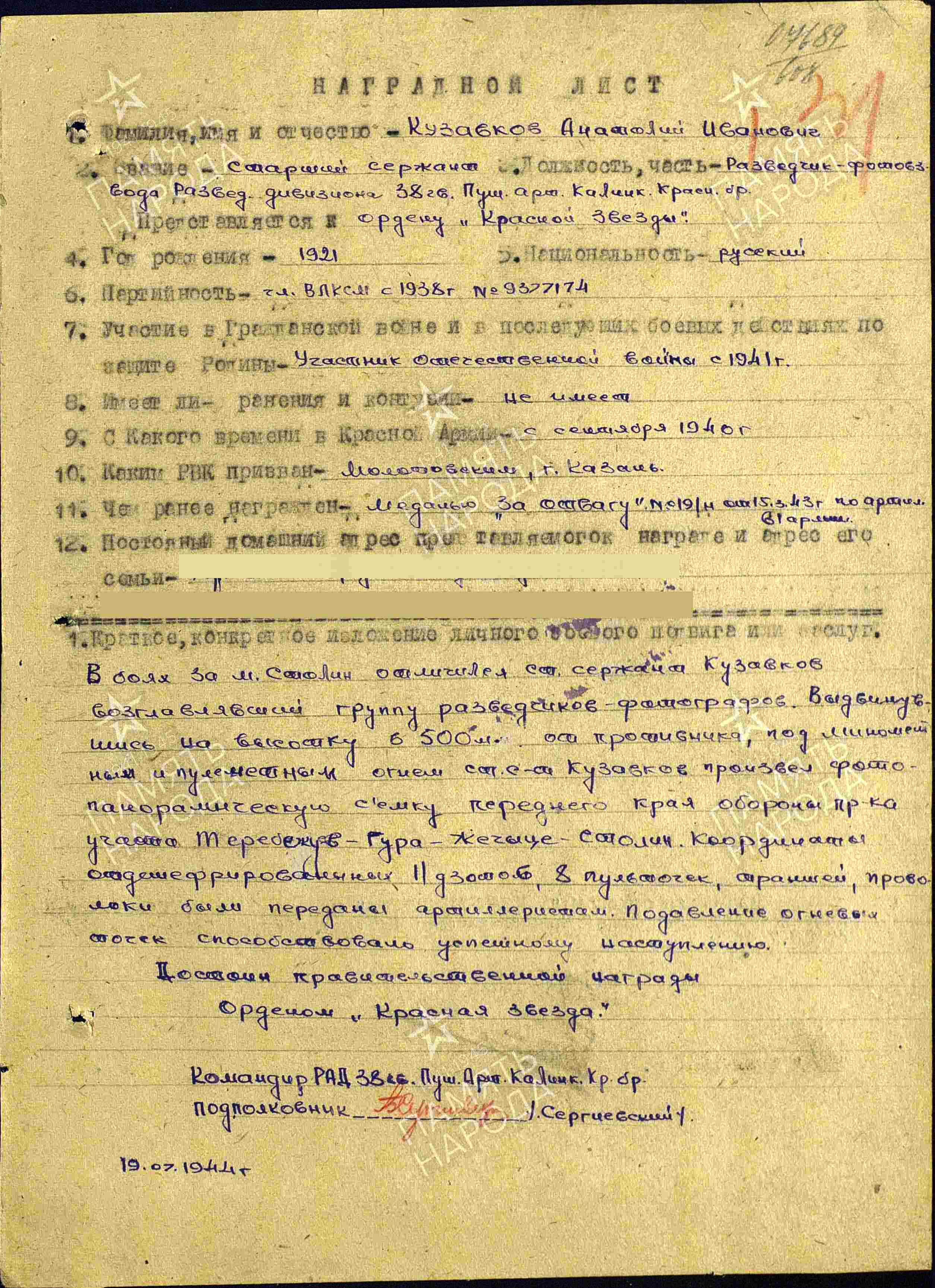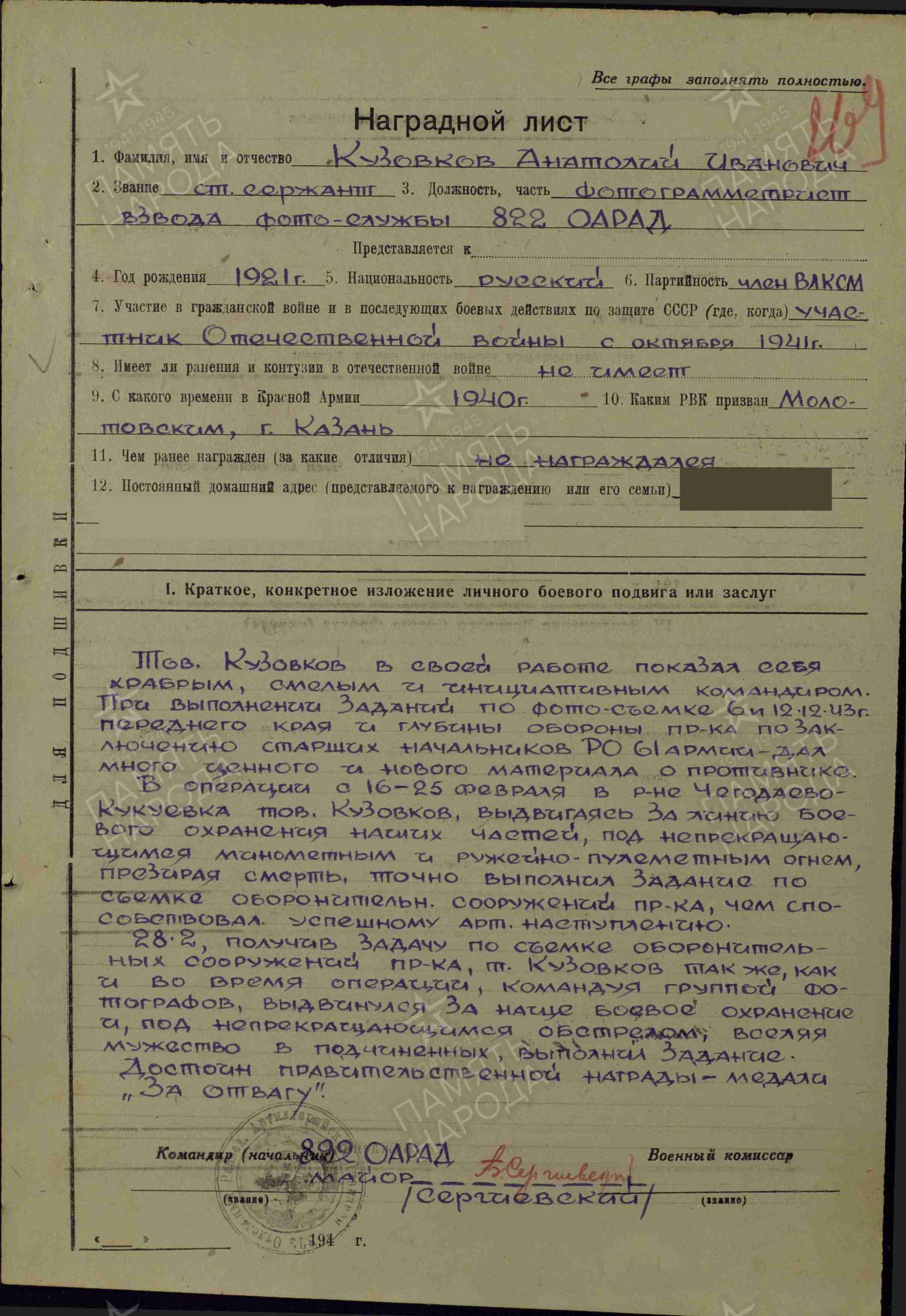 КУЗОВКОВ Анатолий Иванович, 1921, с. Ромодан. Жил в г. Казань. Член ВЛКСМ с 1938. Мобилизован Молотовским РВК 20 сент. 1940. Ст. сержант, фотограмметрист взвода фото службы 822 отд. армейского разведывательного арт. дивизиона 61 А Брянского/ Западного/ Центрального/ Белорусского/ 2 и 1 Белорусского фронта. С мая 1944 – гв. ст. сержант, зам. ком. взвода топографической службы, разведчик-фотограф развед. дивизиона 38 гв. ПАБр 61 А 3 Прибалтийского/ 1 Белорусского фронта. Награждён медалями «За отвагу», «За взятие Берлина», орденами Красной Звезды, Отечественной войны 2 ст. (1985). Демобилизован 20 нояб. 1946. Работал токарем в вагонном депо ст. Казань Горьковской ж/д.
