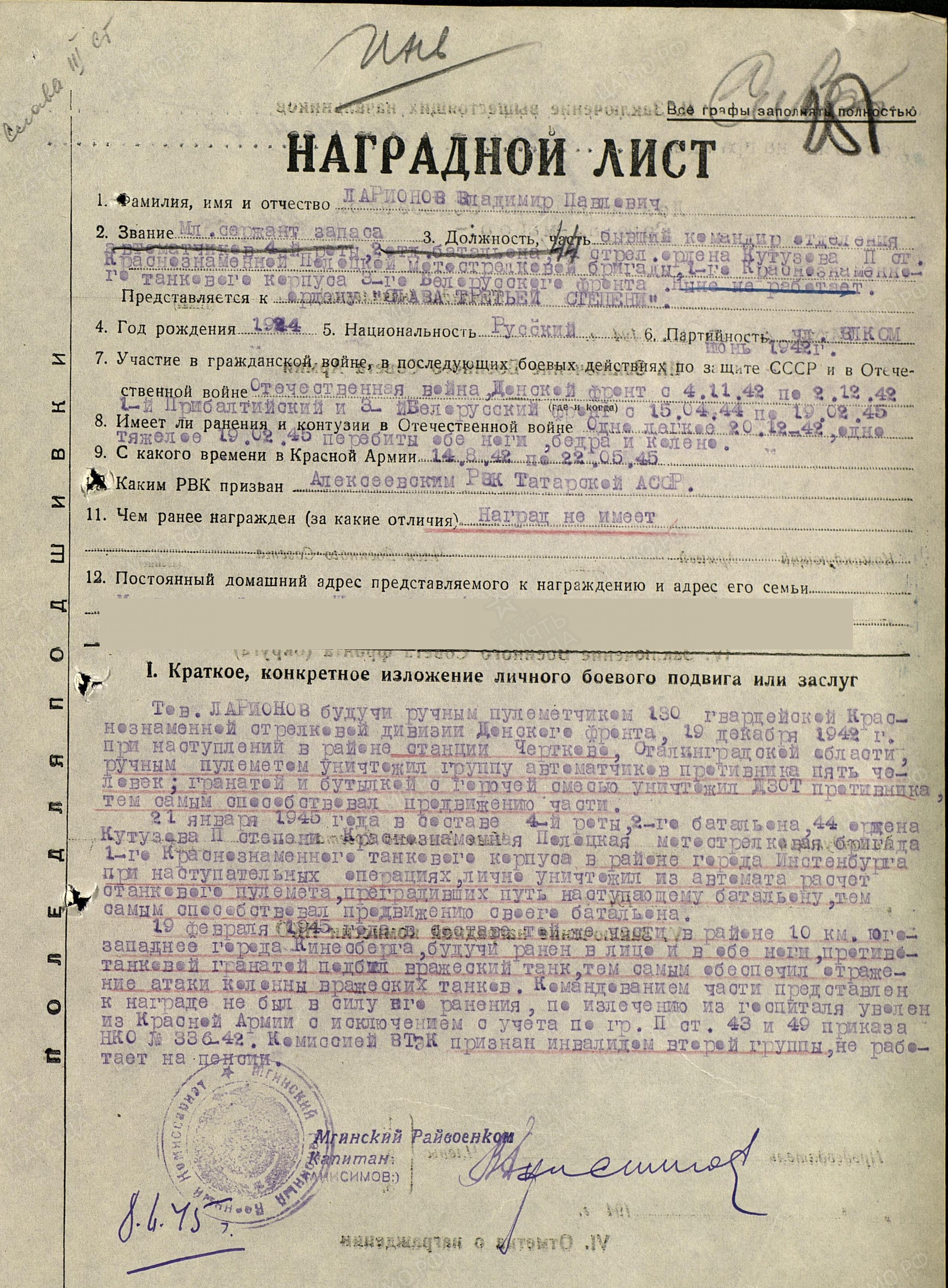 ЛАРИОНОВ Владимир Павлович, 1924, д. Бегуницы Волосовского р-на Ленингр. обл. В 1941 вместе с матерью и двумя младшими сёстрами оказался в эвакуации в ТАССР, с. Алексеевское. Мобилизован Алексеевским РВК 14 авг. 1942. Мл. сержант, пулемётчик. Воевал с 4 нояб. 1942 на ДонФ. В бою за ст. Чертково 19 дек. 1942 огнём пулемёта уничтожил пять автоматчиков, гранатой и бутылкой с зажигательной смесью подавил ДЗОТ противника. 20 дек. 1942 легко ранен. Далее с 1943 воевал в составе 44 МСБр 1 ТК 1 ПрибФ и 3 БелФ, ком. отделения автоматчиков. 21 янв. 1945 в р-не г. Инстенбург лично уничтожил из автомата расчёт станкового пулемёта противника. 19 фев. 1945 юго-зап. г. Кёнигсберг, будучи раненым в лицо и обе ноги, гранатой подбил вражеский танк и обеспечил отражение танковой атаки. В результате тяжёлого ранения уволен из армии по инвалидности 2 гр. Награждён орденом Славы 3 ст. по ходатайству Мгинского РВК Ленинградской обл.
