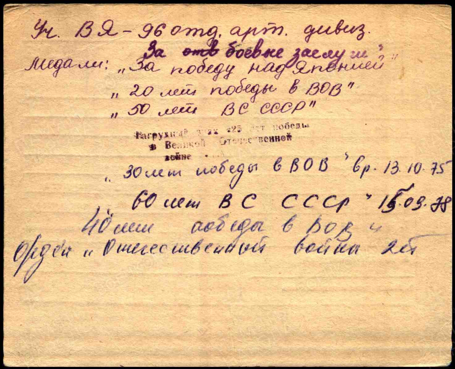 Награды: медали «За боевые заслуги» «За победу над Японией»