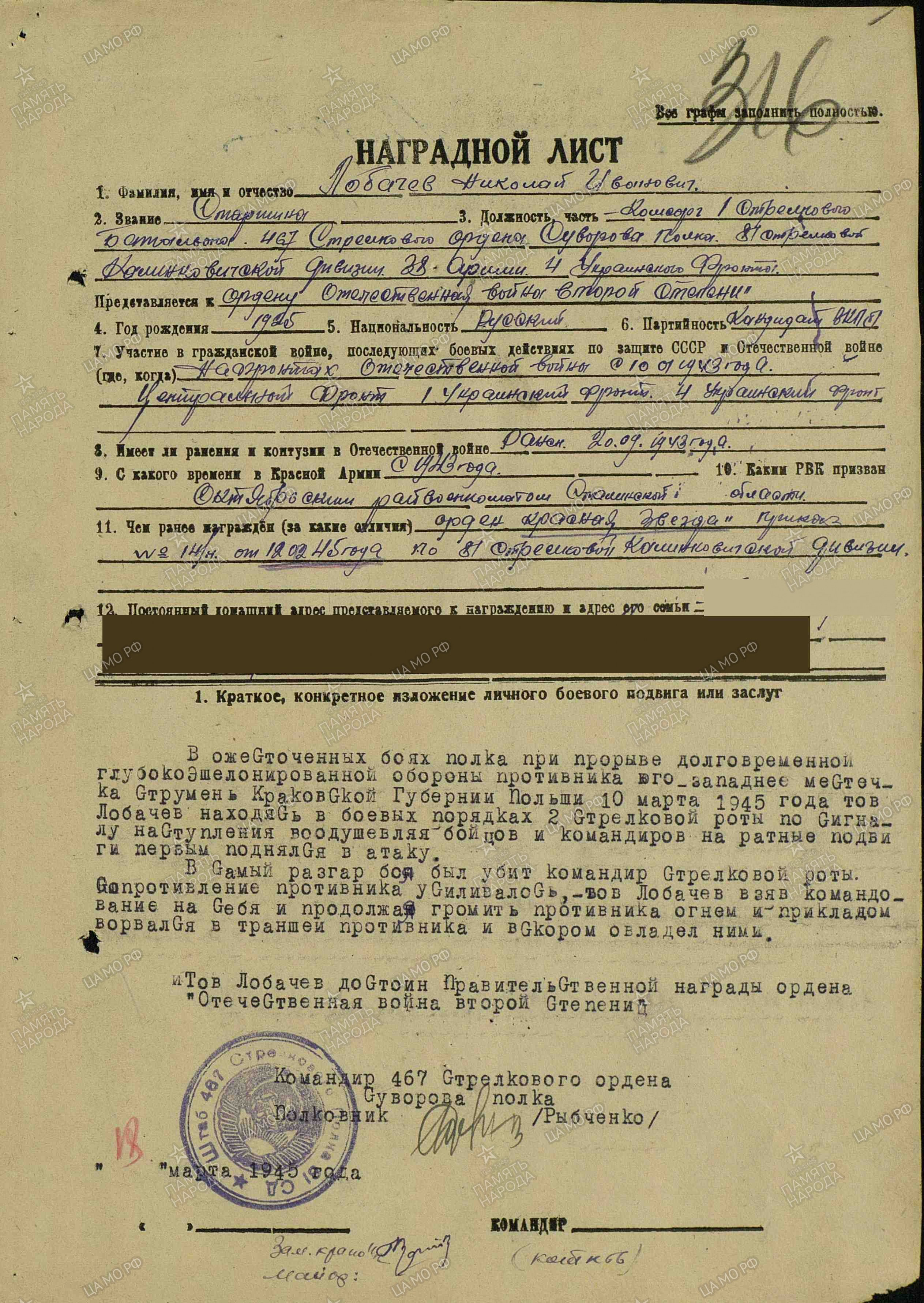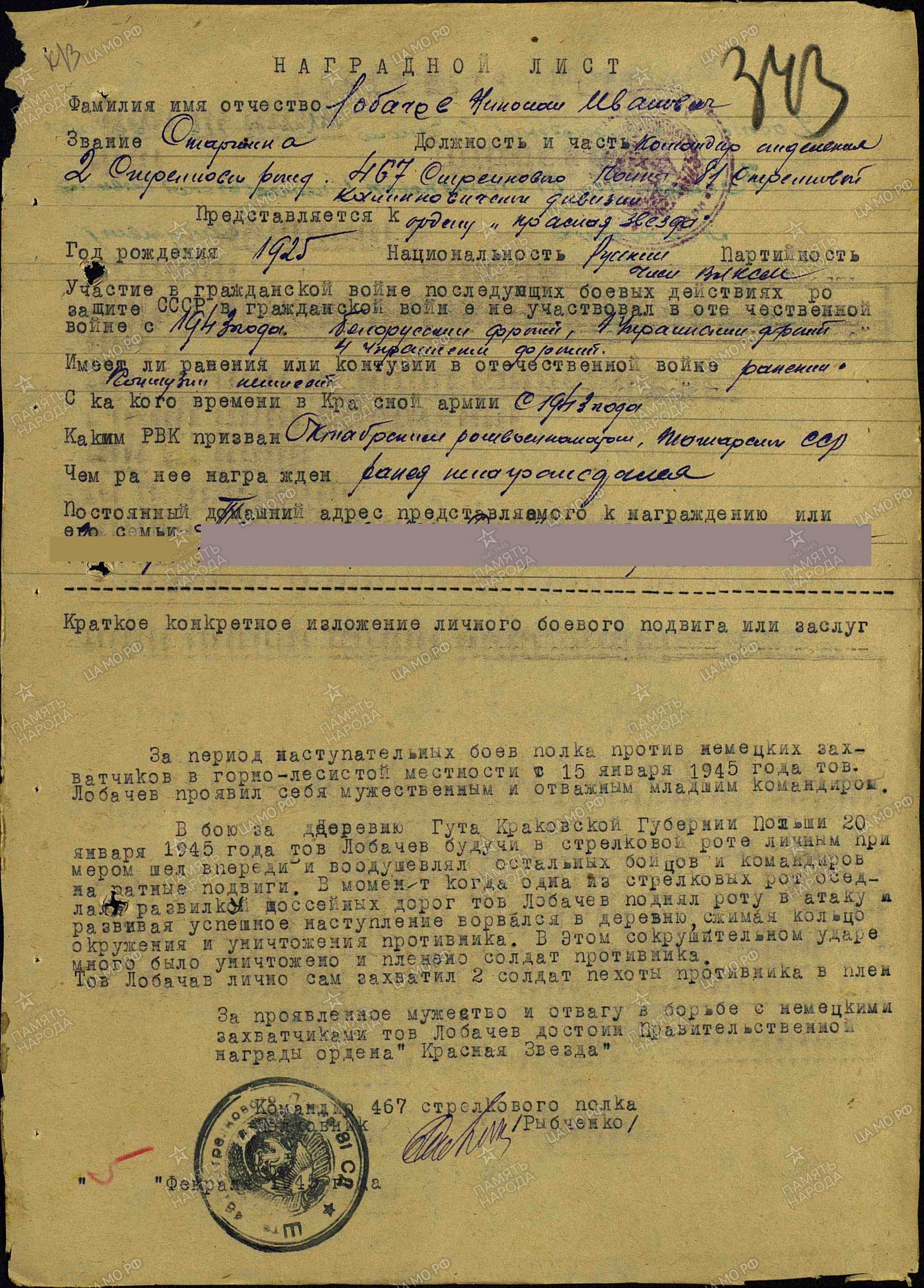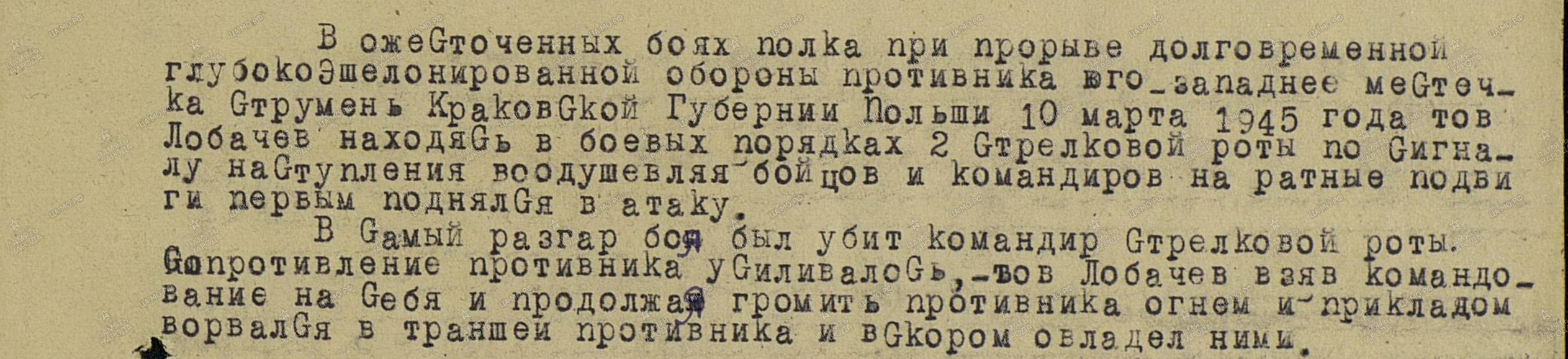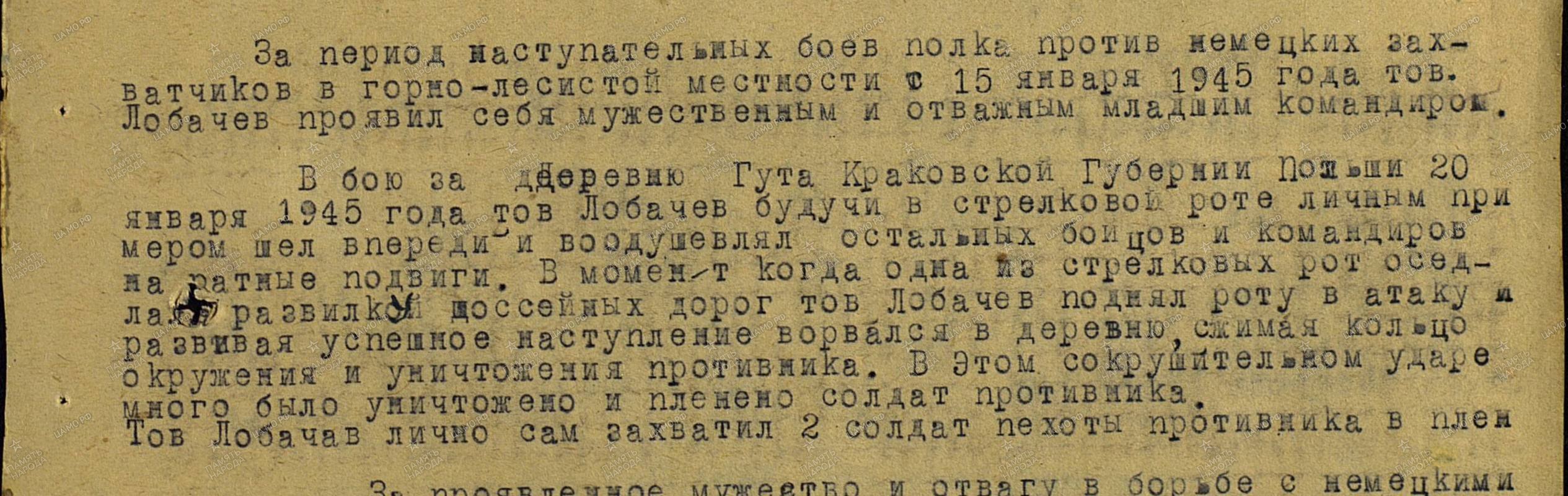 Лобачев Н.И. 1925 года рождения ушел на фронт добровольцем в январе 1943 года в неполные 18 лет. Сражаясь в составе IV Украинского фронта,отличившись смелостью в боях, он сумел снискать к себе уважение однополчан. Его избрали комсоргом батальона при политотделе 38 армии. Разведчик, младший сержант Лобачев Н.И. позднее сражался в составе Центрального фронта. В боях на Курской дуге получил тяжелое ранение, но после выздоровления вновь вернулся в строй. Он участвовал в боях за Киев, Ровно, прошел с боями Германию, закончил войну в Чехословакии, в Праге, где был вновь ранен.