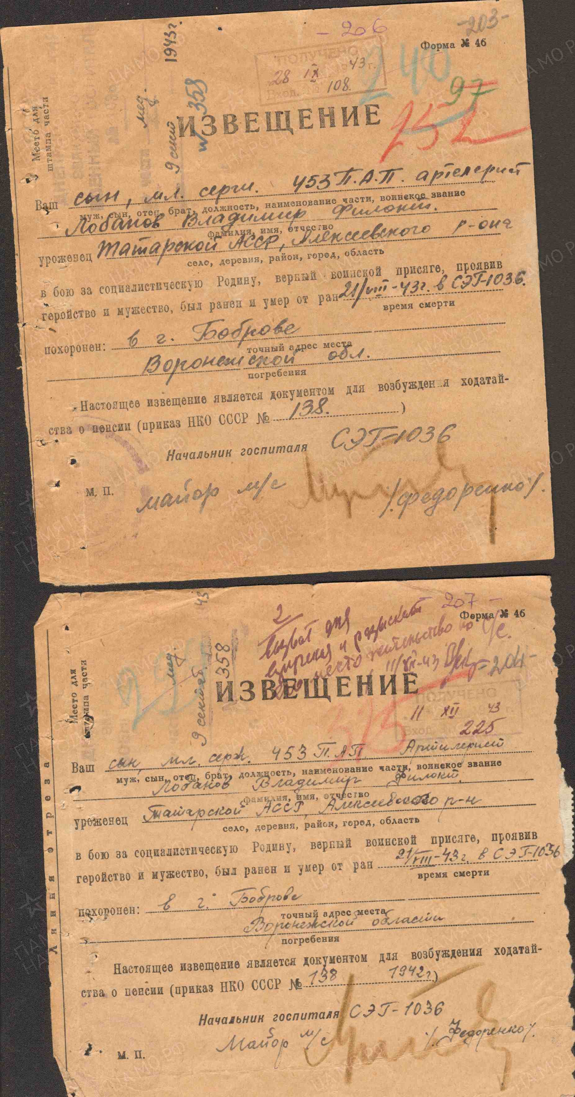 ЛОБАНОВ Владимир Феоктистович, 1924, д. Войкино. Мобилизован 7 сент. 1942 Алексеевским РВК. Мл. сержант, наводчик 453 ПАП 36 ПАБр 40 А Воронежского фронта. 13 июня 1943 получил тяжёлые химические ожоги. 2 июля поступул в ЭГ 1036, г. Бобров, Воронежская обл. Умер 21 авг. 1943.