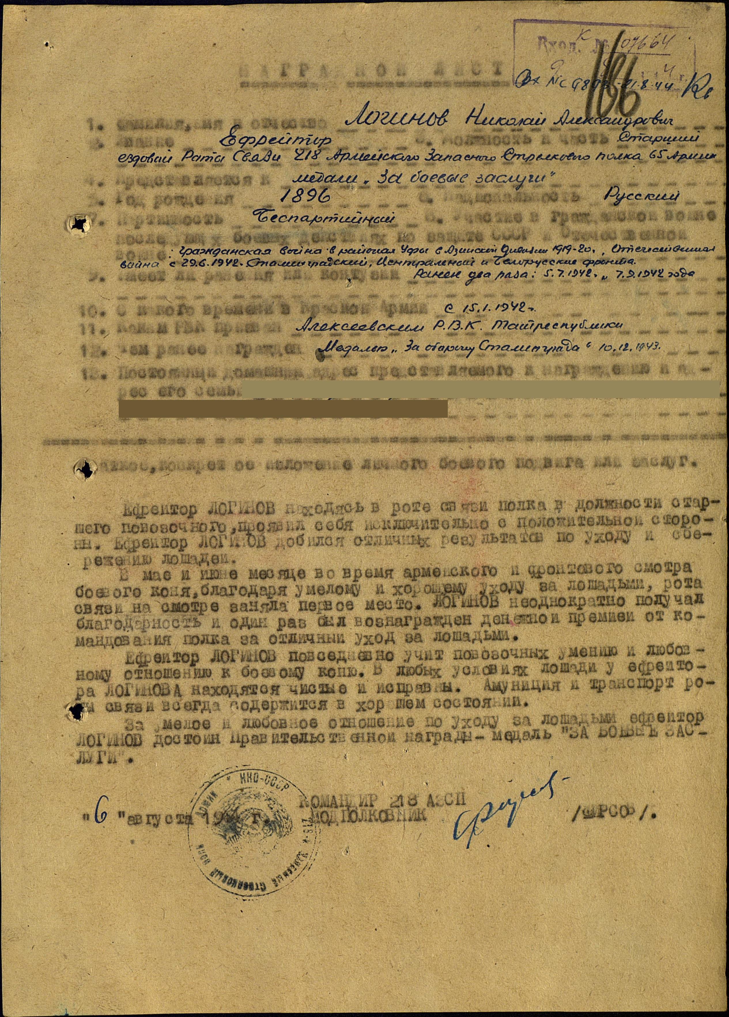 ЛОГИНОВ (ЛОГВИНОВ) Николай Александрович (Андреевич), 1896, с. Лебяжье. Участник Гражданской войны в 1919-1920 в р-не г. Уфа в составе Азинской дивизии. До призыва в армию работал в к-зе «Перекоп». Мобилизован 15 янв. 1942 Алексеевским РВК. Красноармеец. Воевал на Сталинградском, Донском, Центральном, Белорусском, 1/2 Белорусском фронтах. В боях перенёс два ранения: 5 июля и 7 сент. 1942. В 1944 - ефрейтор, старший ездовой роты связи 218 запасного СП 65 А. Награждён медалью «За оборону Сталинграда», орденом Отечественной войны 2 ст. (1944).