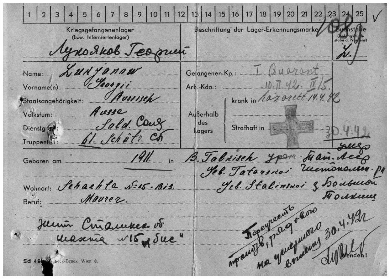 Родился в 1911 г. в с. Большой Толкиш Чистопольского уезда Казанской губернии. Рядовой Лукьянов (Лукоянов) Георгий погиб в плену 30 апреля 1942 г. Первичное место захоронения: Проскуров/Ракова.