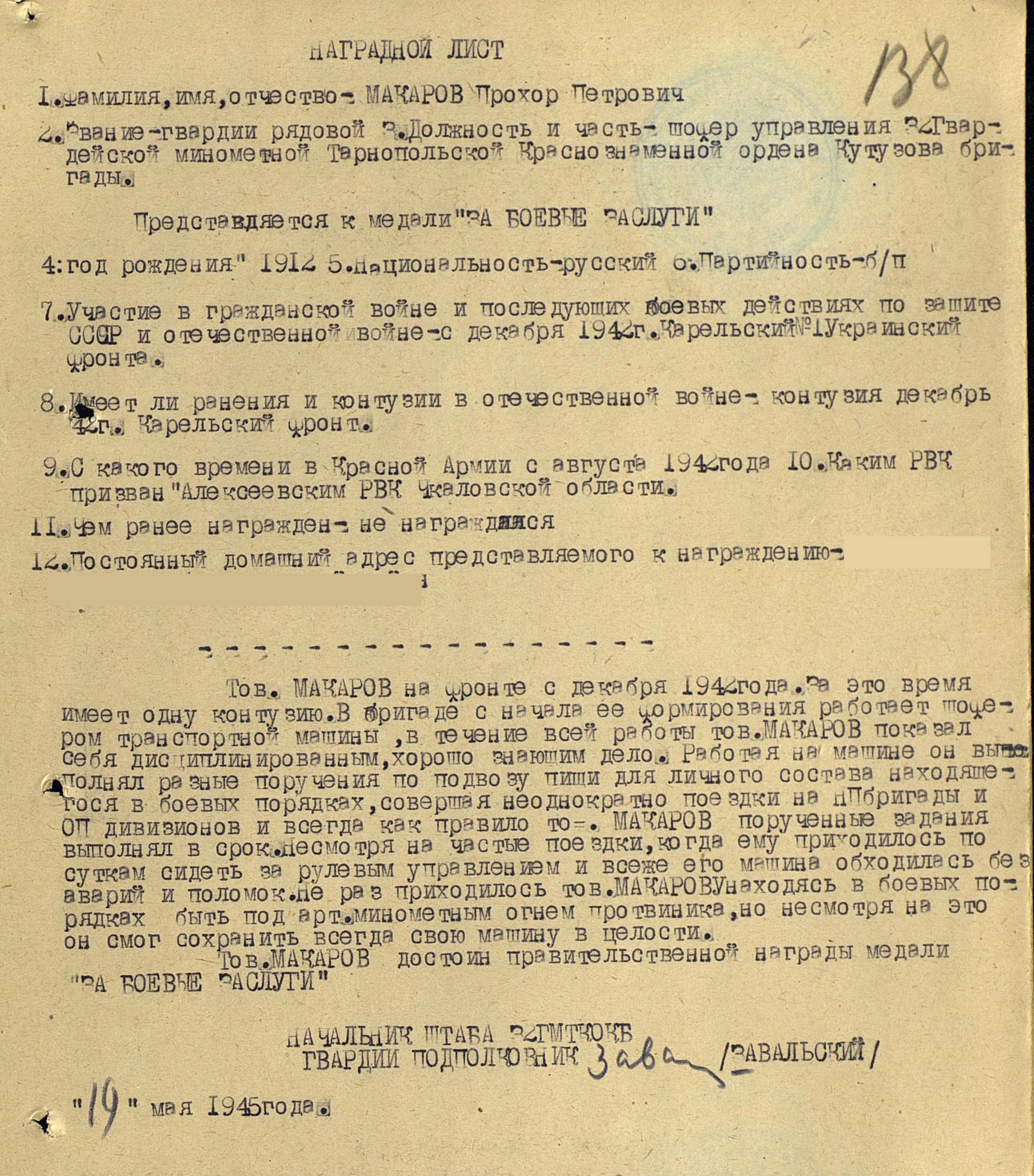 МАКАРОВ Прохор Петрович, 1912, с. Куркуль. Мобилизован Алексеевским РВК в августе 1942 г. На фронте с декабря месяца 1942 г. - Карельский фронт. Шофёр транспортной машины управления 32 гвардейской миномётной бригады 3 гв. миномётной дивизии, гв. красноармеец. В том же месяце был конужен. В последующем воевал на 1 Укр. фронте. Награждён медалями "За боевые заслуги" и "За победу над Германией". После войны работал в колхозе "Ясная поляна". Скончался в 1984 г., похоронен в с. Куркуль.