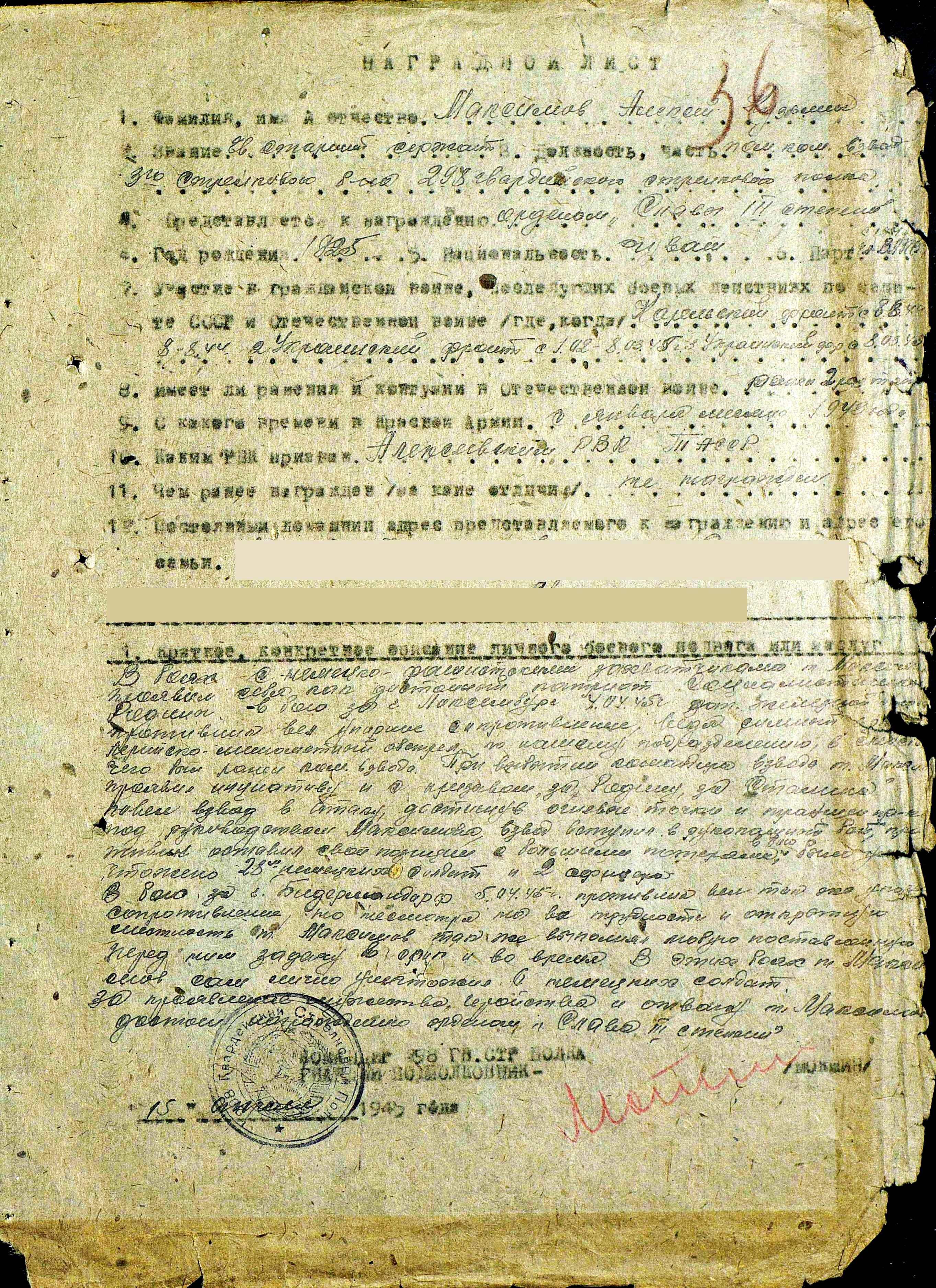 МАКСИМОВ Алексей Кузьмич, 1925, д. Солонцы. Мобилизован Алексеевским РВК в янв. 1943. Член ВЛКСМ. Проходил подготовку в 9 гв. ВДБр 15 гв. ВДД. С 1944 - гв. ст. сержант, пом. ком. взвода 298 гв. СП 100 гв. СД КарелФ, 2 и 3 УкрФ. Дважды тяжело ранен. В боях на территории Австрии, 4 апр. 1945, после ранения ком. взвода, принял командование на себя и с призывом «За Родину! За Сталина!» повёл бойцов в атаку. Взвод, достигнув вражеских траншей, в рукопашной схватке уничтожил до 30 солдат и офицеров противника. После войны продолжил службу кадровым офицером. Награждён орденами Славы 3 ст., Отечественной войны 2 ст. (1985), медалями "За взятие Вены", "За боевые заслуги" (1953).