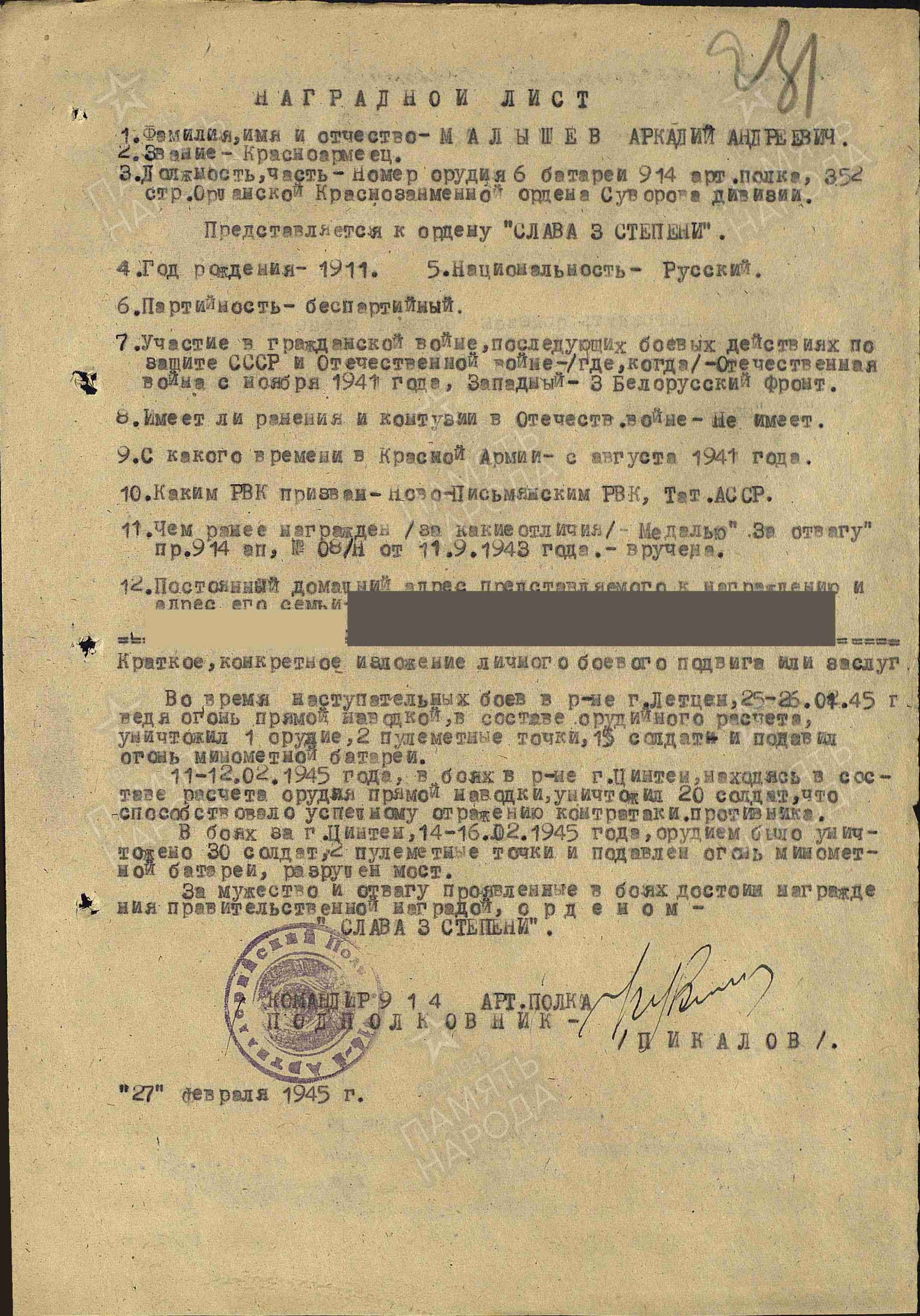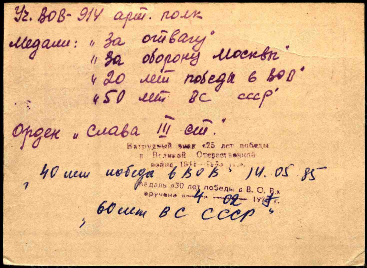 красноармеец рядовой. Воевал на 2 Белорусском фронте, воинская часть 914 артиллерийский полк 352 стрелковой дивизии.
