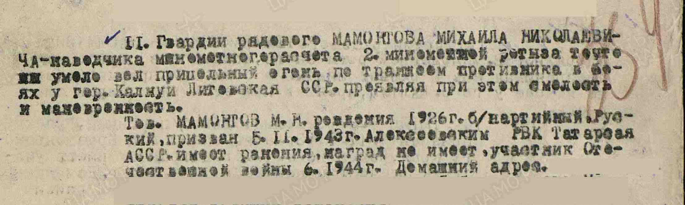 МАМОНТОВ Михаил Николаевич, 1926, с. Лебедино. До призыва в армию работал в к-зе «Восход». Член ВЛКСМ. Мобилизован Алексеевским РВК 5 нояб. 1943. В боях с июня 1944. Участник освобождения Белоруссии и Прибалтики. Гв. красноармеец, наводчик миномётного расчёта мин. роты 56 гв. СП 19 гв. СД 39 А З Белорусского/ 1 Прибалтийского фронта. Имел ранения. Награждён медалью «За отвагу» в окт. 1944. Дальнейшая судьба не установлена.