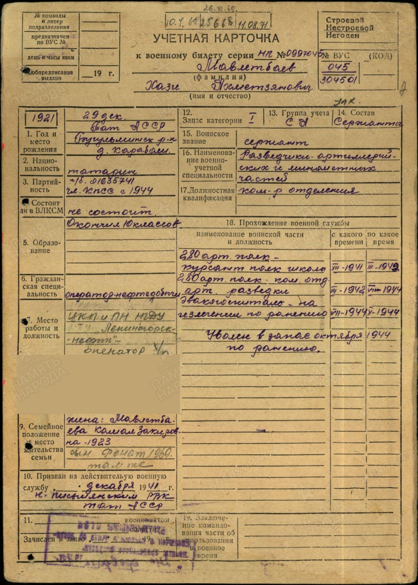 Родился 29.12 1921г. в п. Карабаш, ныне Бугульминский район РТ. До армии – колхозник.
