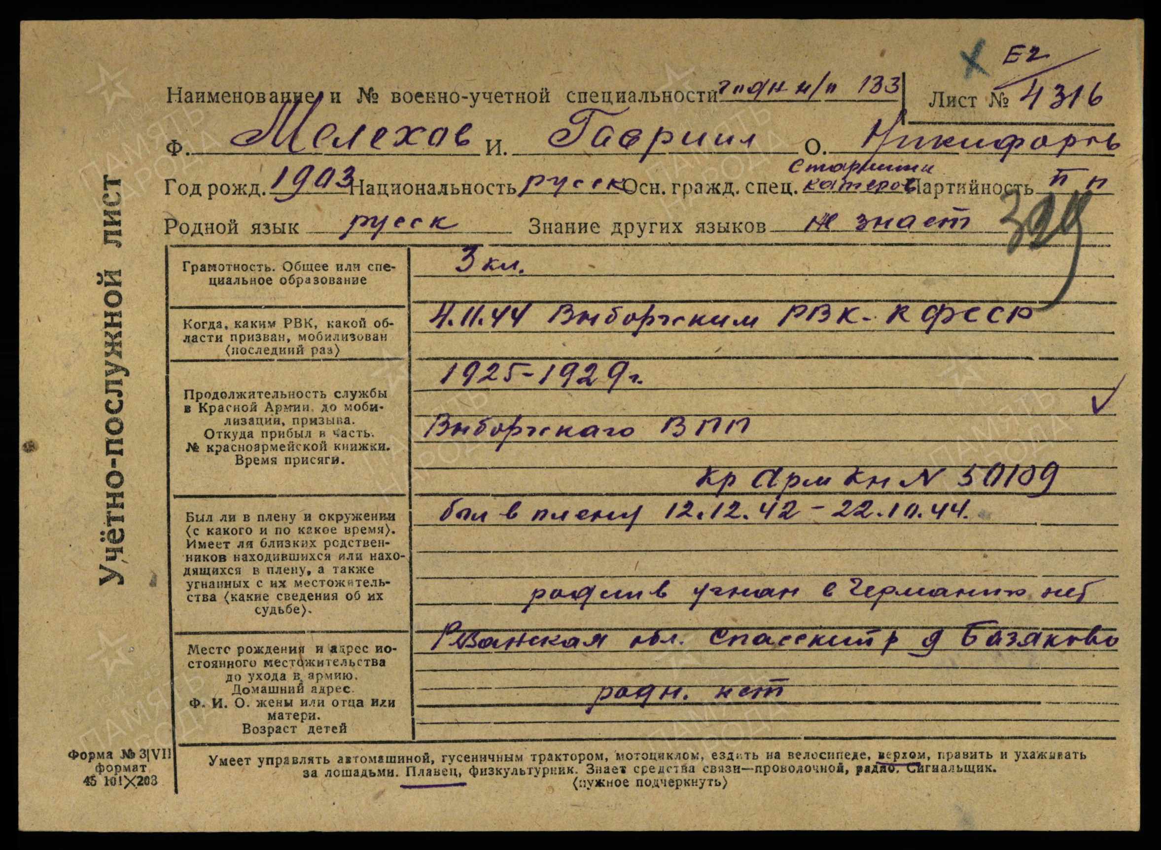 МЕЛЕХОВ Гавриил Никифорович, 1903, с. Базяково. Мобилизован в 1941. Красноармеец. 12 дек. 1942 попал в плен. Освобождён 22 окт. 1944. Повторно мобилизован Выборгским РВК КФССР 4 нояб. 1944.