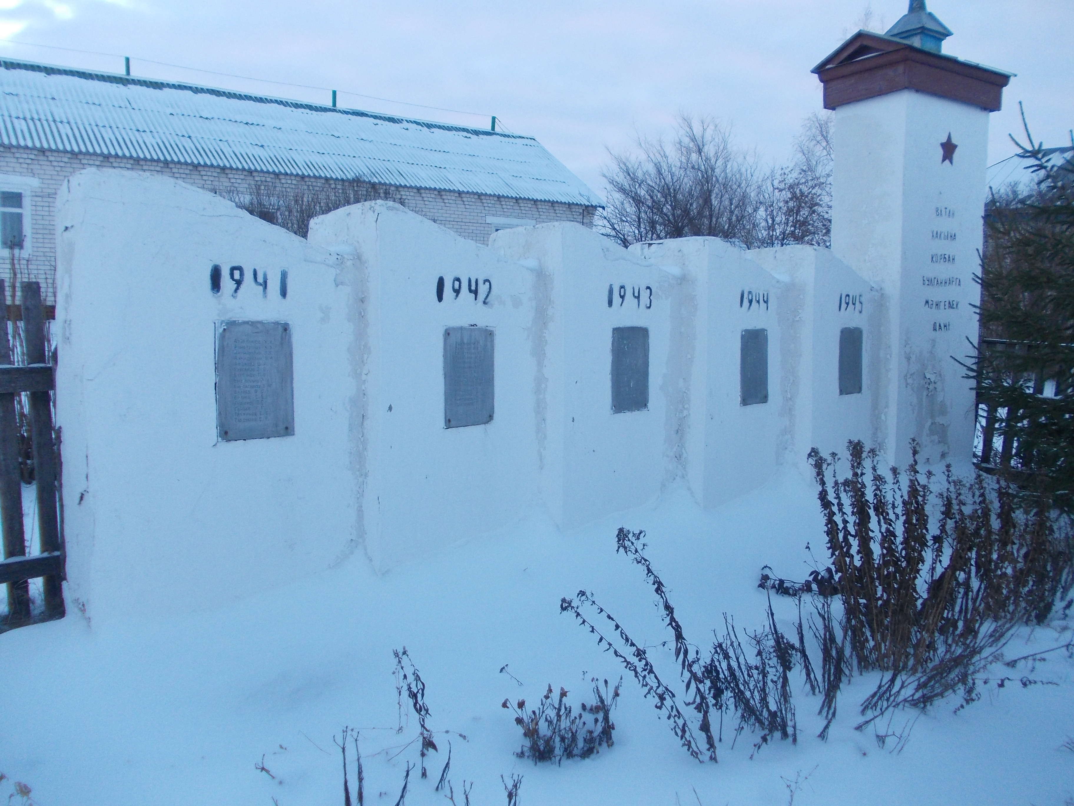 Сложен из кирпича заштукатурен и побелен. Список умерших на нержавейке(5 листов),На основной колонне(6х3) имеется надпись:Ватан хакына һәлак булганарга мәңгелек дан!"