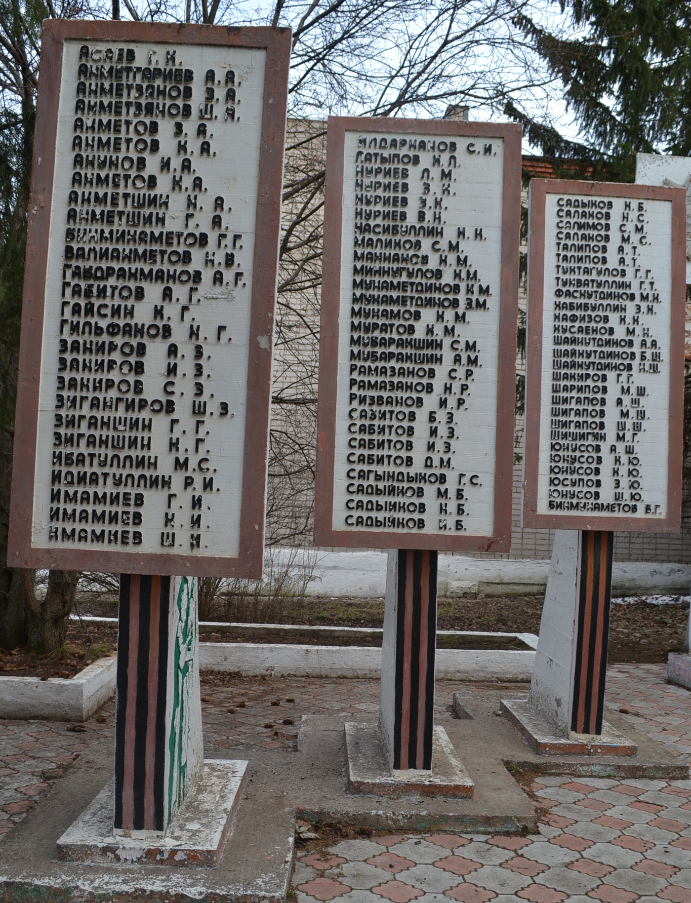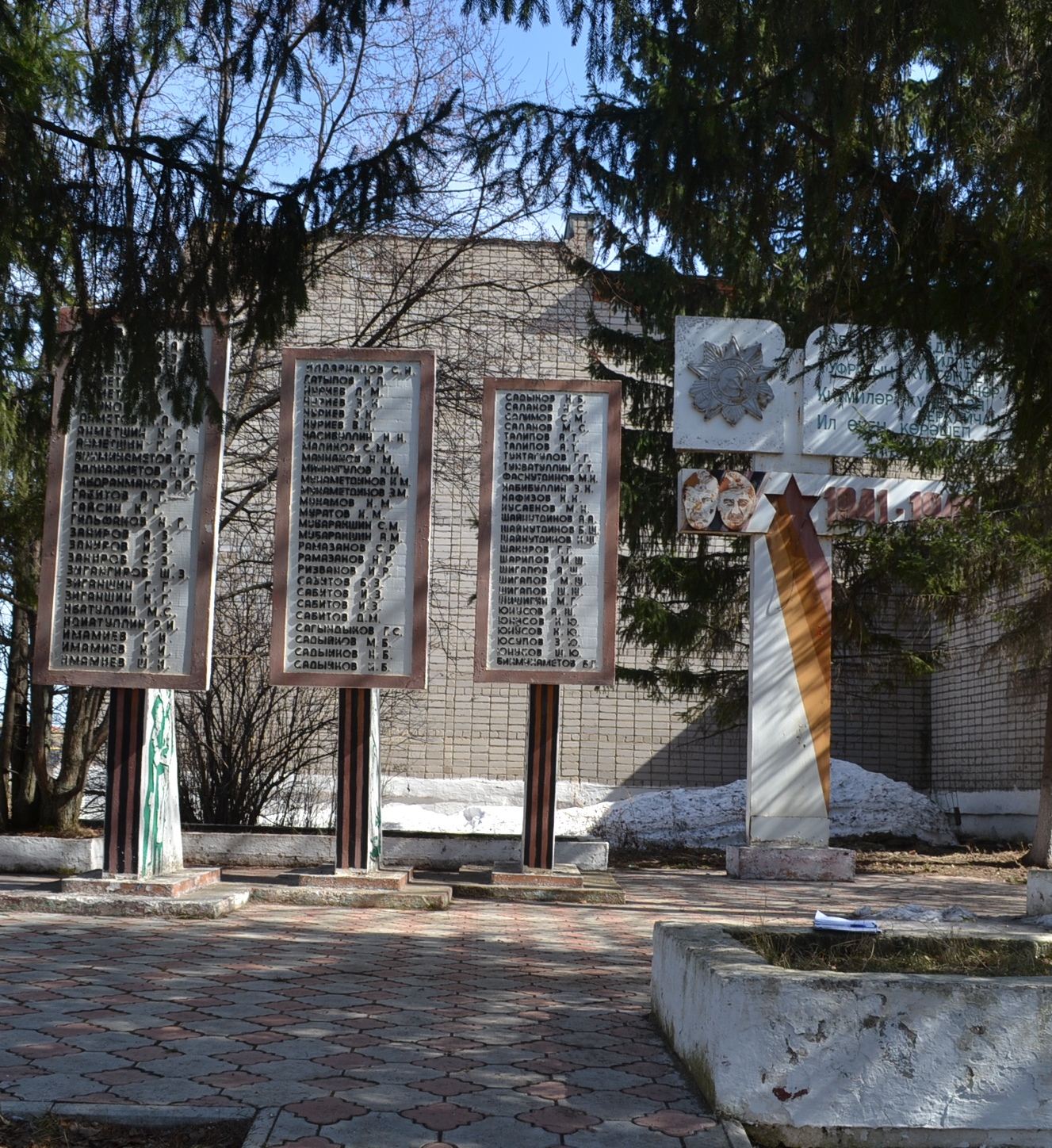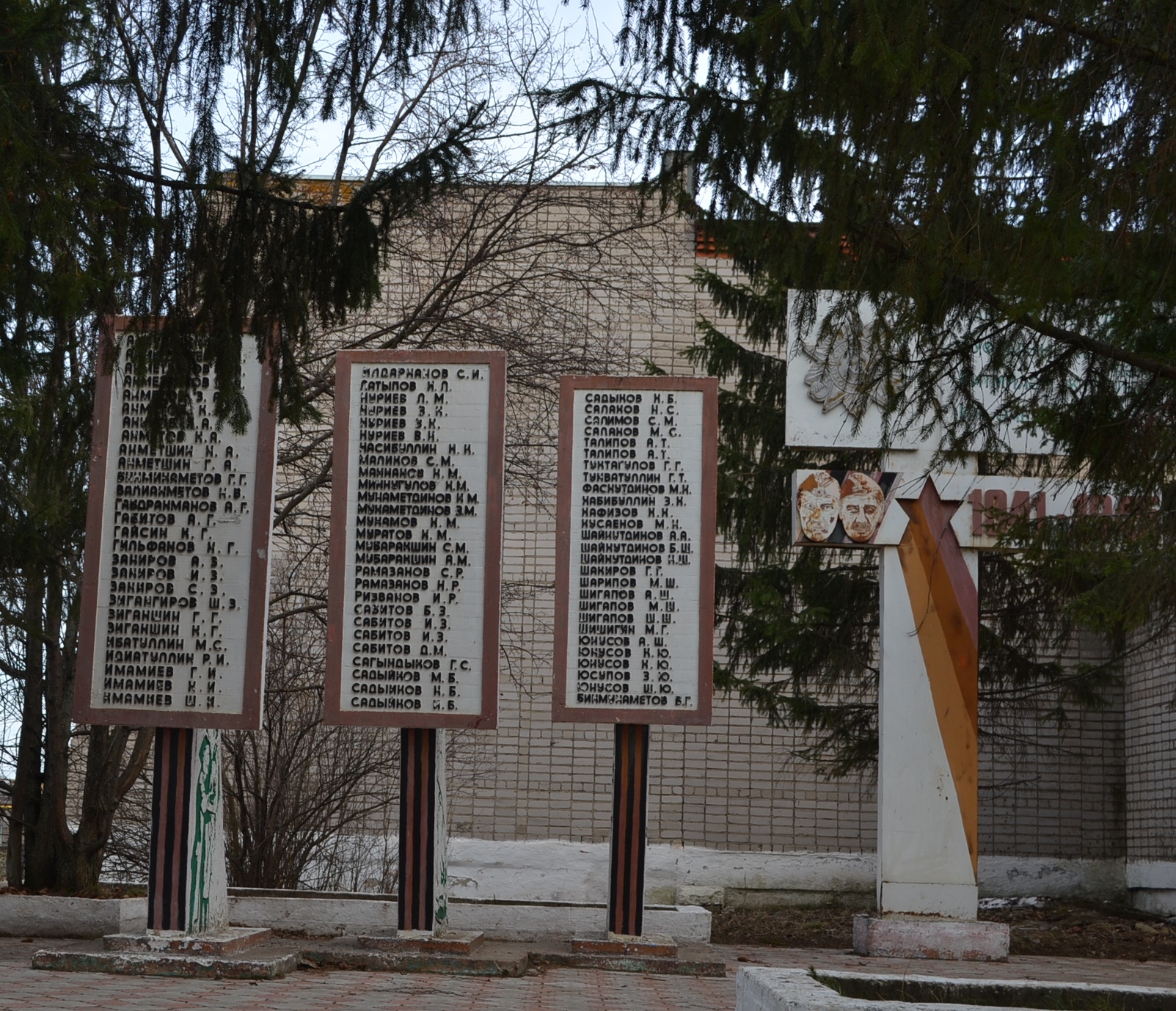 Мемориальная композиция состоит из: стелы с надписью "Каберен кайдадыр билгесез, Туфрагын кумгэндер улэннэр, Китмилэр куделдэн беркайчас Ил эчен кэрэшеп улгэннэр" и трех мемориальных досок с выбитыми на камне фамилиями павших, Памятник располагается в парке у Дома кулжтуры, имеет бктонное основание, зеленые насаждения. Датировка объекта 1988 год.
