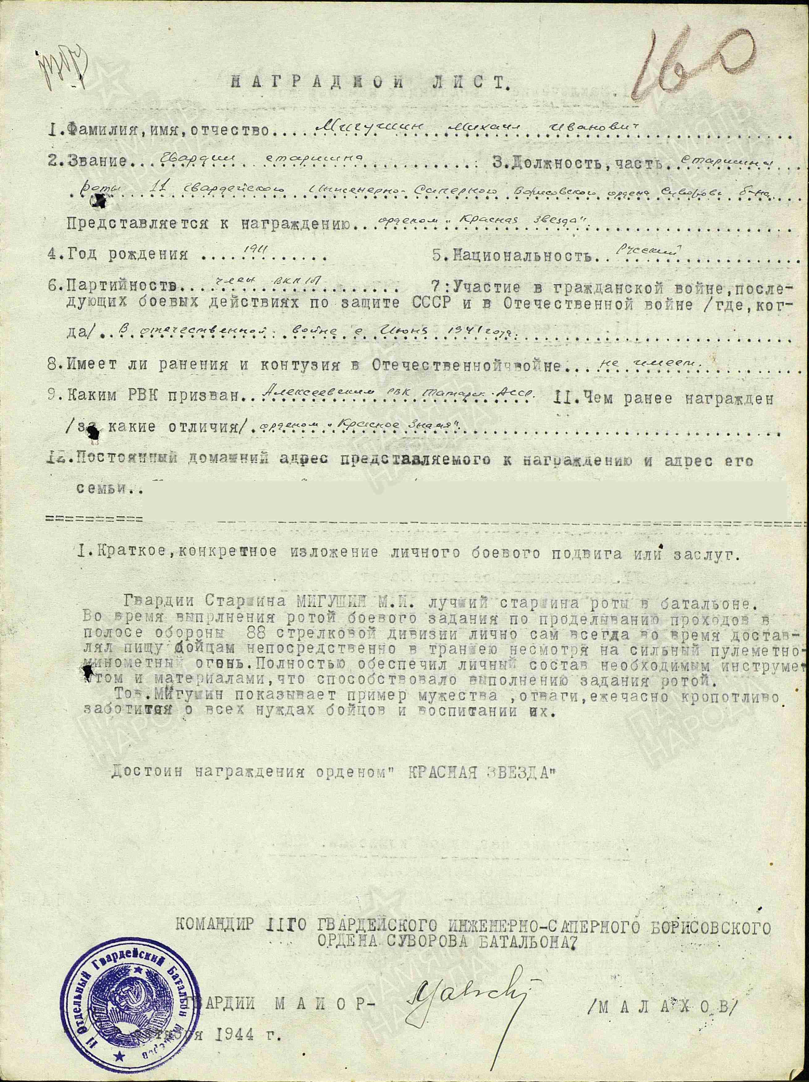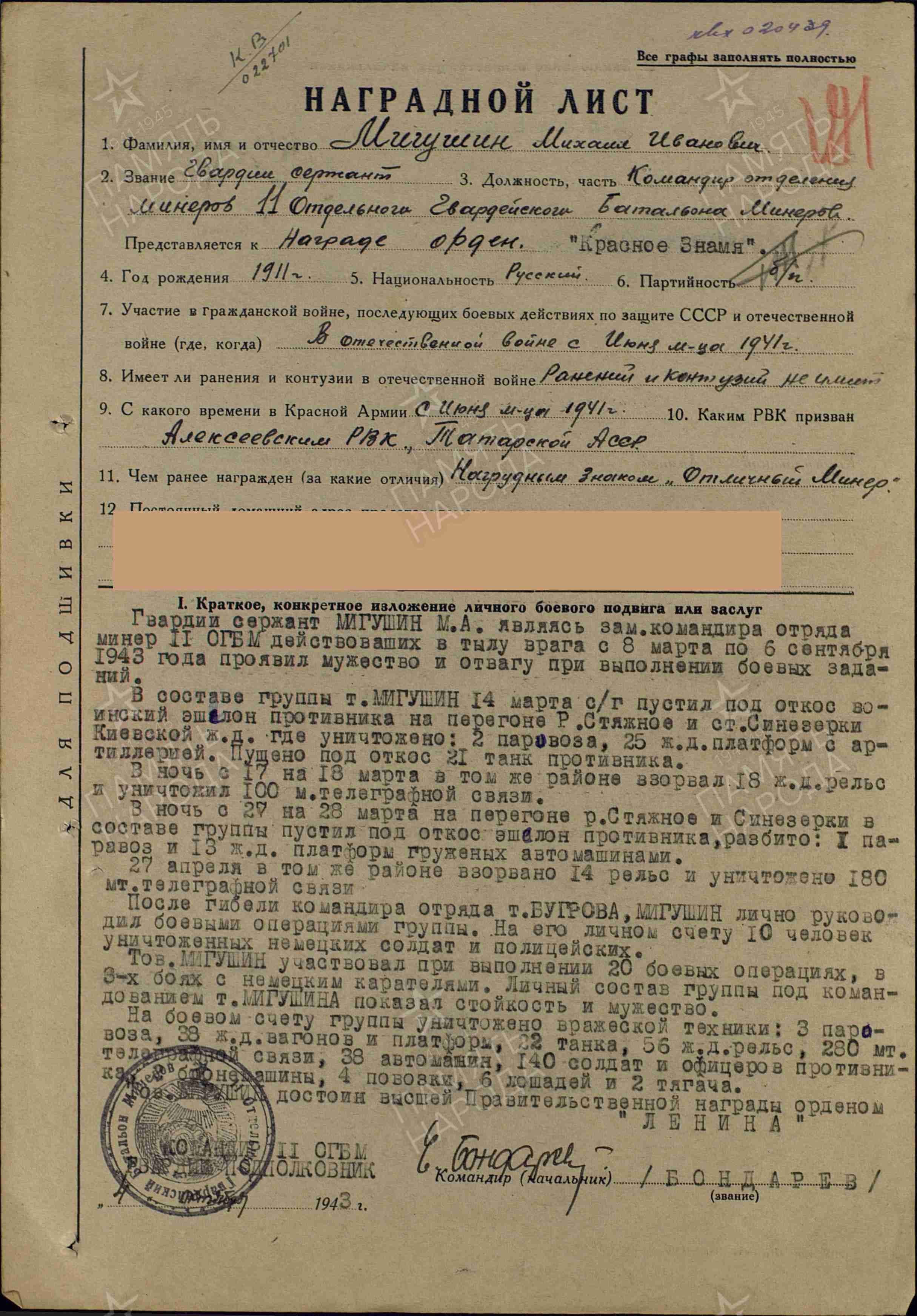 МИГУШИН Михаил Иванович, 1911, с. Остолопово. Мобилизован Алексеевским РВК 25 июня 1941. Мл. нач. состав, 129 отд. мото-инженерный сапёрный батальон; гв. сержант, ком. отделения 11 отд. гв. батальона минёров Западного/ 3 Белорусского фронта; гв. старшина, ротный старшина 11 отд. гв. инженерно-сапёрный батальон 31 инженерно-сапёрной бригады 31 А 3 БелФ и 1 УкрФ. Награждён знаком «Отличный минёр», медалью «За оборону Москвы», орденами Красного Знамени, Красной Звезды. Скончался в 1968.