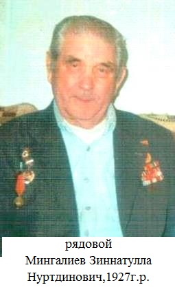 Мингалиев Зиннатулла Нуртдинович родился в 1927 году. Фронтовик. Участник Великой Отечественной войны 1941-1945гг. Призван Алькеевским РВК ТатАССР в 1943 году. (Фотография и материалы предоставлены Салманским сельским поселением)