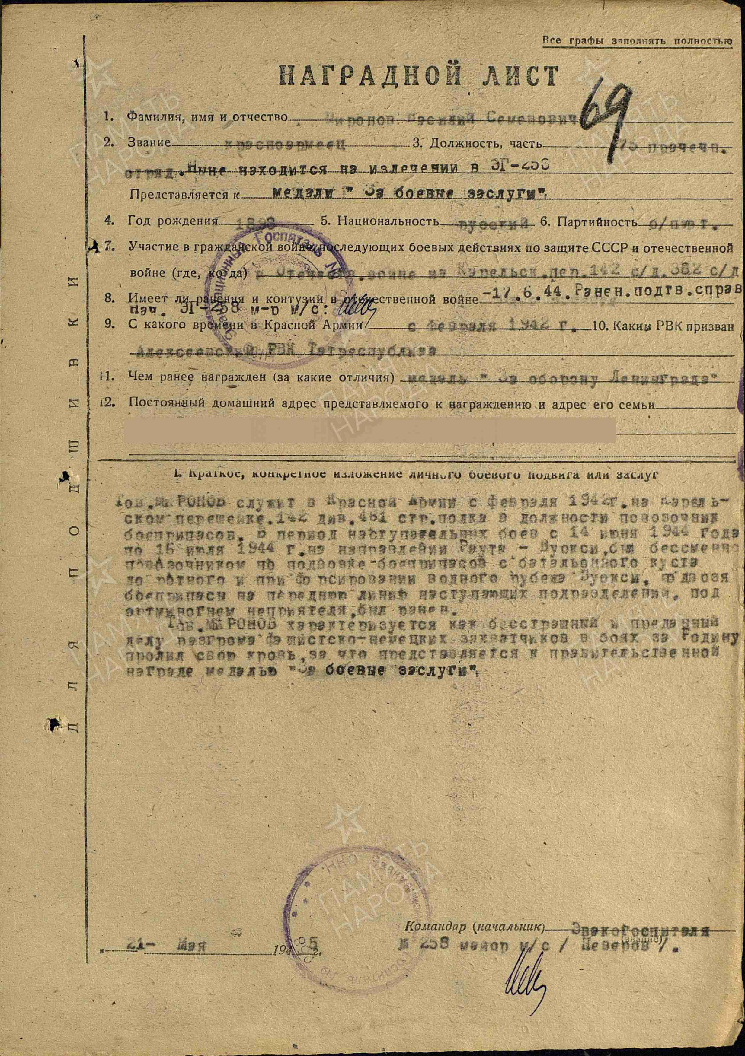 МИРОНОВ Василий Семёнович, 1898, с. Сергиевское. Участник Гражданской войны в 1918-1921. До призыва в армию работал в к-зе Им. Карла Маркса. Мобилизован Алексеевским РВК в фев. 1942. Красноармеец. Первоначально направлен в 88 БАО 5 Района авиационного базирования. С 3 марта 1943 воевал в составе 461 СП 142 СД 23 А/ 67 А Ленинградского фронта в должности повозочного-подносчика боеприпасов. Ранен 17 июня 1944 в боях на р. Вуокси, Карельский перешеек. Проходил лечение в ЭГ 82, г. Ленинград, до 18 авг. 1944. После излечения служил в 75 прачечном отряде 23 А ЛенФ. Награждён медалью «За оборону Ленинграда», орденом Красной Звезды (1945).