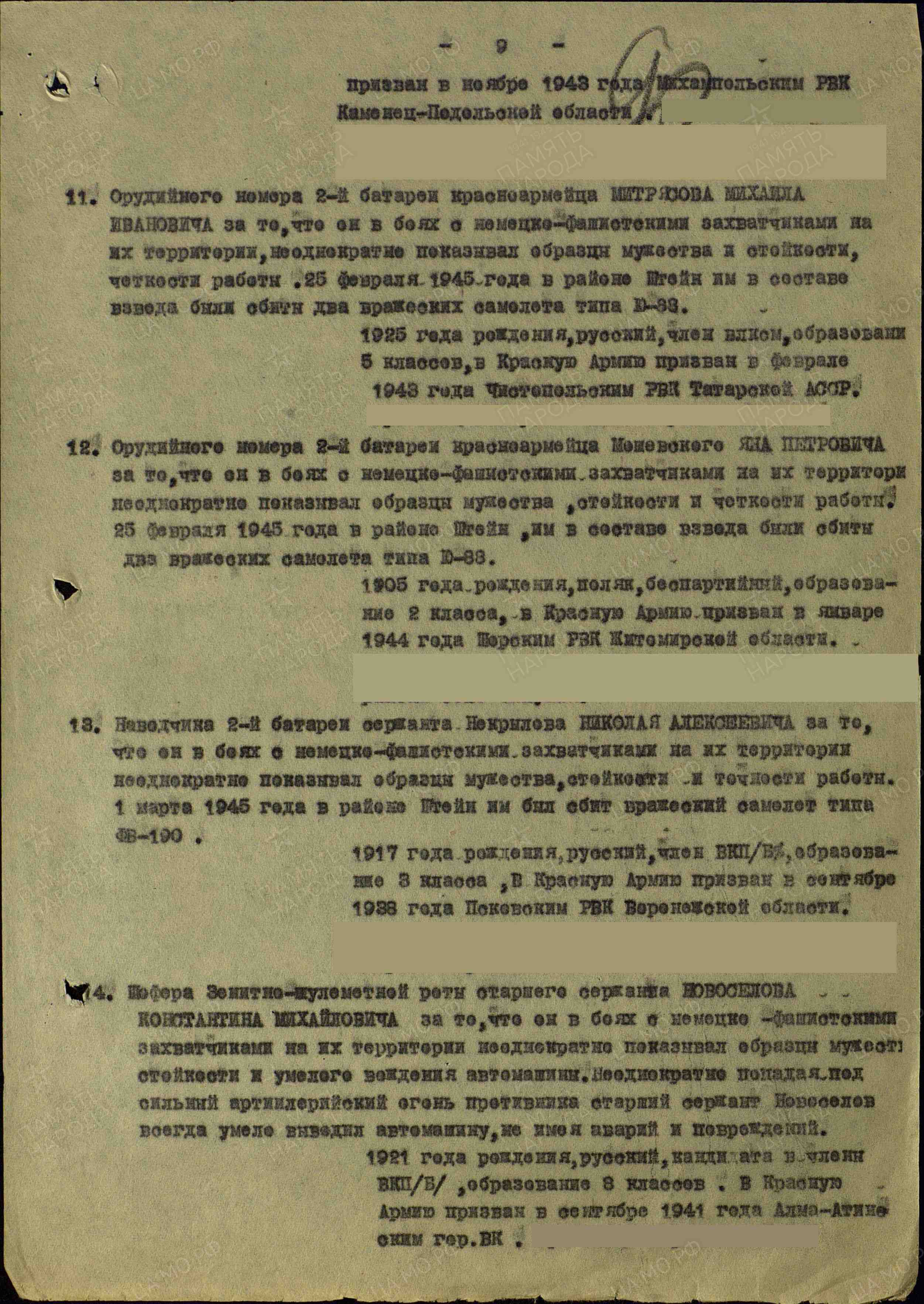 Михаил Иванович Митрясов родился в 1925 (1926) г. в г.Чистополе, ТАССР. В 1943 г. призван в ряды Красной Армии Чистопольским военным комиссариатом. Служил орудийным номером 2-й батареи. В боях с немецко-фашистскими захватчиками на их территории, неоднократно показывал образцы мужеств и стойкости, четкости работы. 25 февраля 1945 г. в районе Игейн им в составе взвода были сбиты два вражеских самолета типа Ю-33.
