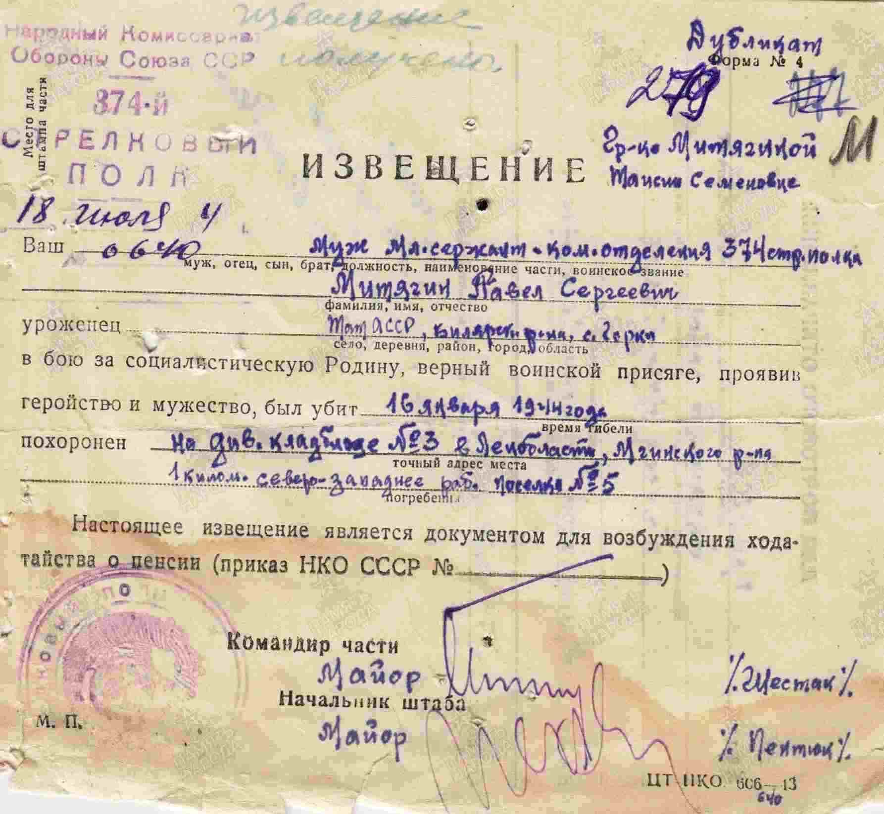 МИТЯГИН Павел Сергеевич, 1912, с. Богоявленская Горка. Работал учителем сельской школы в с. Новоспасск, Заинский р-н. Мобилизован Акташским РВК 1 фев. 1940 (финская война), 27 окт. 1942. Воевал на Ленинградском фронте в составе 2 УдА/ 42 А/ 67 А. Гв. красноармеец, стрелок 190 гв. СП 63 гв. СД/ мл. сержант, ком. отделения 374 СП 128 СД. Член ВКП(б). Награждён медалью «За оборону Ленинграда». Погиб 15/16 янв. 1944, р.п. № 5, Мгинский р-н, кв. 41-94. Увековечен на мемориальном комплексе «Синявинские высоты», п. Синявино-1.