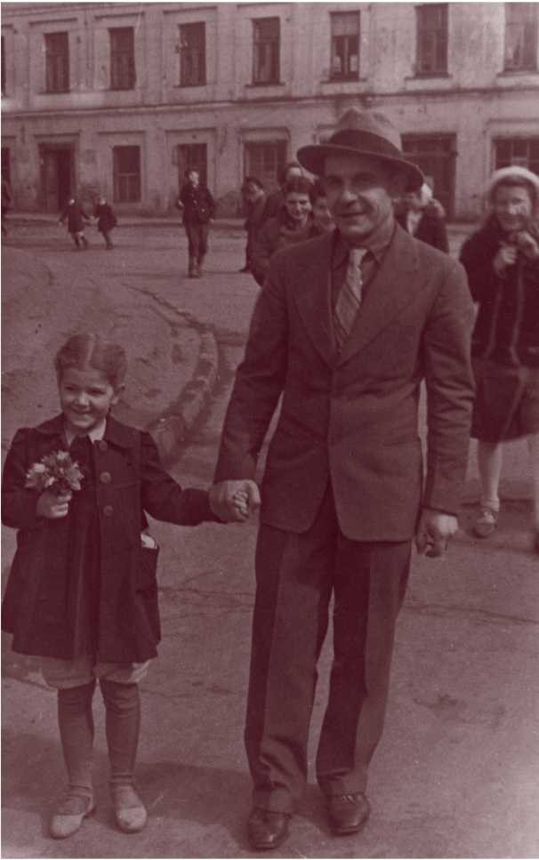 9 мая 1945 года помнится, как и всем, отлично. Утром мама приходит из госпиталя — плачет. Ночью скончался раненый. И ее слезы были из сердца — вырвалось напряжение военных лет. Мы с папой едем в музей, по пути нас фотографирует журналист — фото сохранилось: мое бархатное платьице мало, из-под него видны штанишки, да и обувь уже тесна. Я кончала первый класс… Сидим на подоконнике в Бауманском РК ВКП (б) на ул. Баумана, 2 этаж. Разбрасываем листовки. Все высыпали на улицы — хотелось быть вместе, слиться в единстве. Незабываемо. Неповторимо. По улице проезжают артисты цирка Дурова в коляске, запряженной животными.
