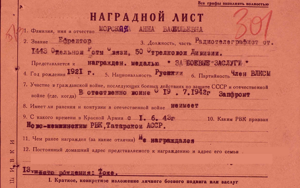 Морская Анна Васильевна родилась в 1921 году. Звание: ефрейтор. В РККА с 01.06.1943 года. Место призыва: Ново-Шешминский РВК, Татарская АССР, Ново-Шешминский р-н. Место службы: 1443 орс 50 сд. Дата подвига: 20.07.1943-21.07.1943 Нараждена 09.08.1943 медалью «За боевые заслуги».