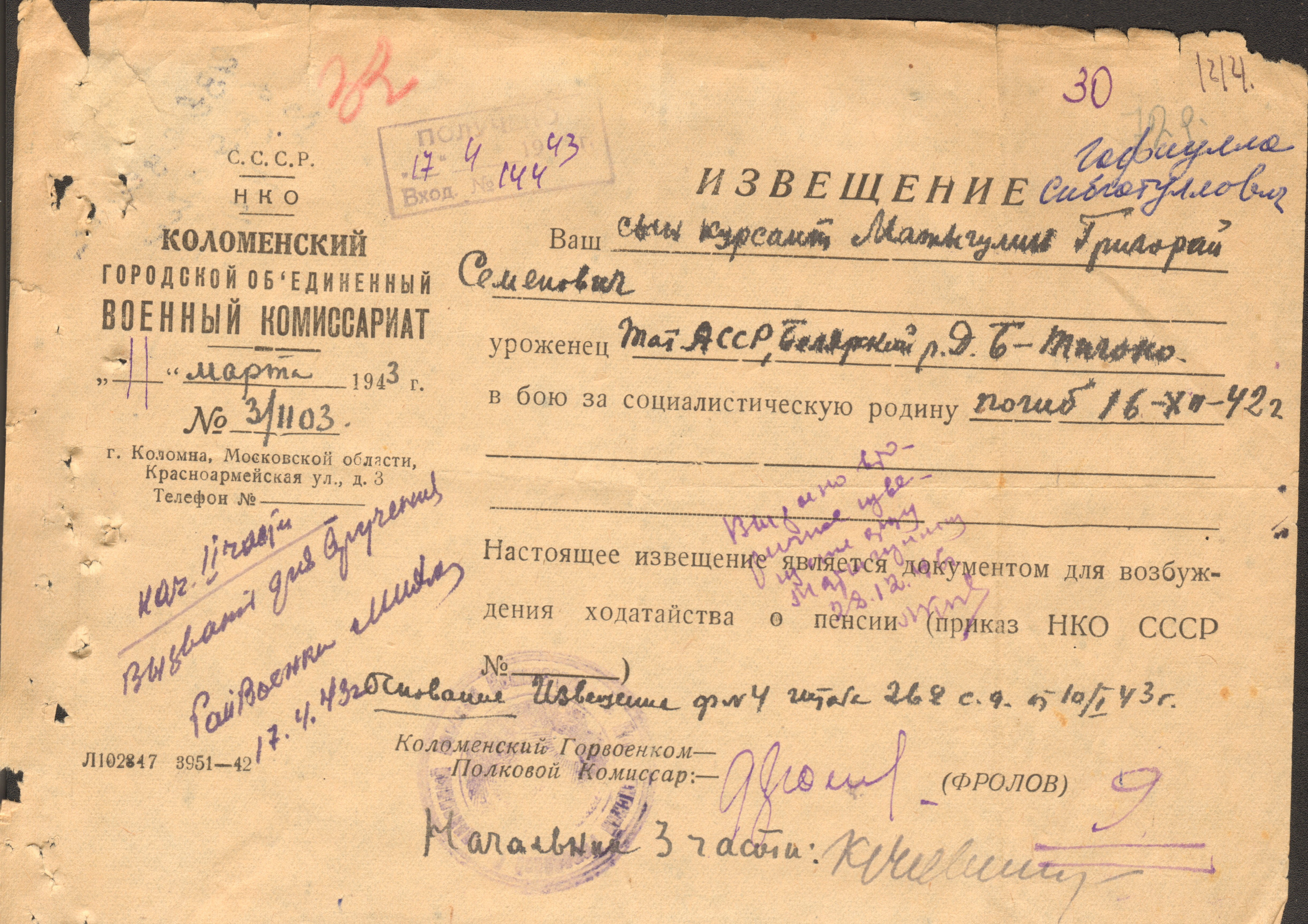 МОТЫГУЛЛИН Гафиулла Сибгатуллович. В Книгах памяти учтён как МАРТЫГУЛИН (МУТЫГУЛЛИН) Григорий Семёнович. 1923 г.р., уроженец бывш. Билярского р-на, с. Большие Тиганы. Мобилизован Коломенским РВК Московской обл. Курсант, красноармеец 262 СД. Погиб на фронте 16 декабря 1942 г.