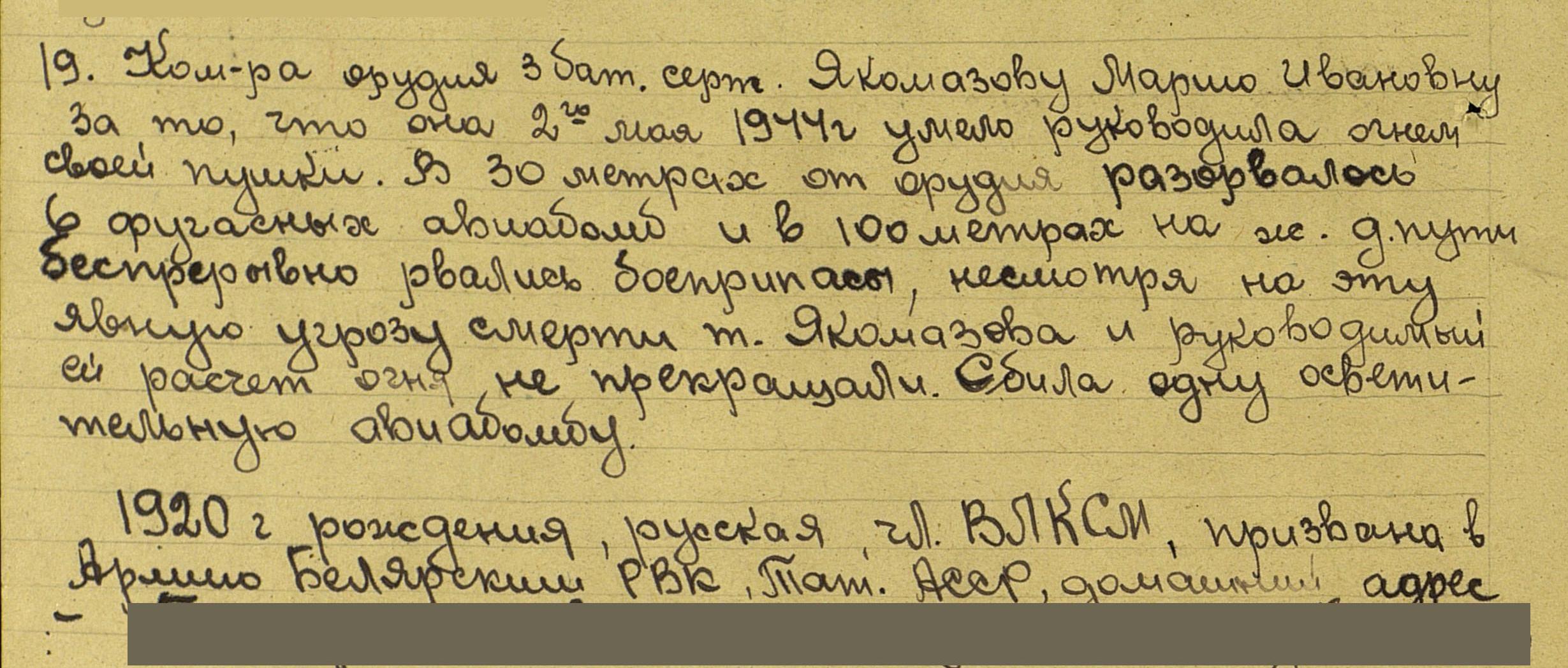 МУХАЛИНА (ЯКОМАЗОВА) Мария Ивановна, 1920, д. Берёзовка. До призыва в армию работала в к-зе «Победа Сталина», секретарь сельского совета. Член ВЛКСМ. Мобилизована Билярским РВК 20 нояб. 1942. Сержант, ком. орудия 383 ЗенАП Харьковского и Киевского дивизионного района Западного фронта ПВО, 7/9 корпуса Южного фронта ПВО, 85 дивизии Южного и Юго-Западного фронта ПВО прикрытия объектов 2, 3 и 4 Украинского фронта. Демобилизована 31 июля 1945. Награждена медалью «За боевые заслуги», орденом Отечественной войны 2 ст. (1985).