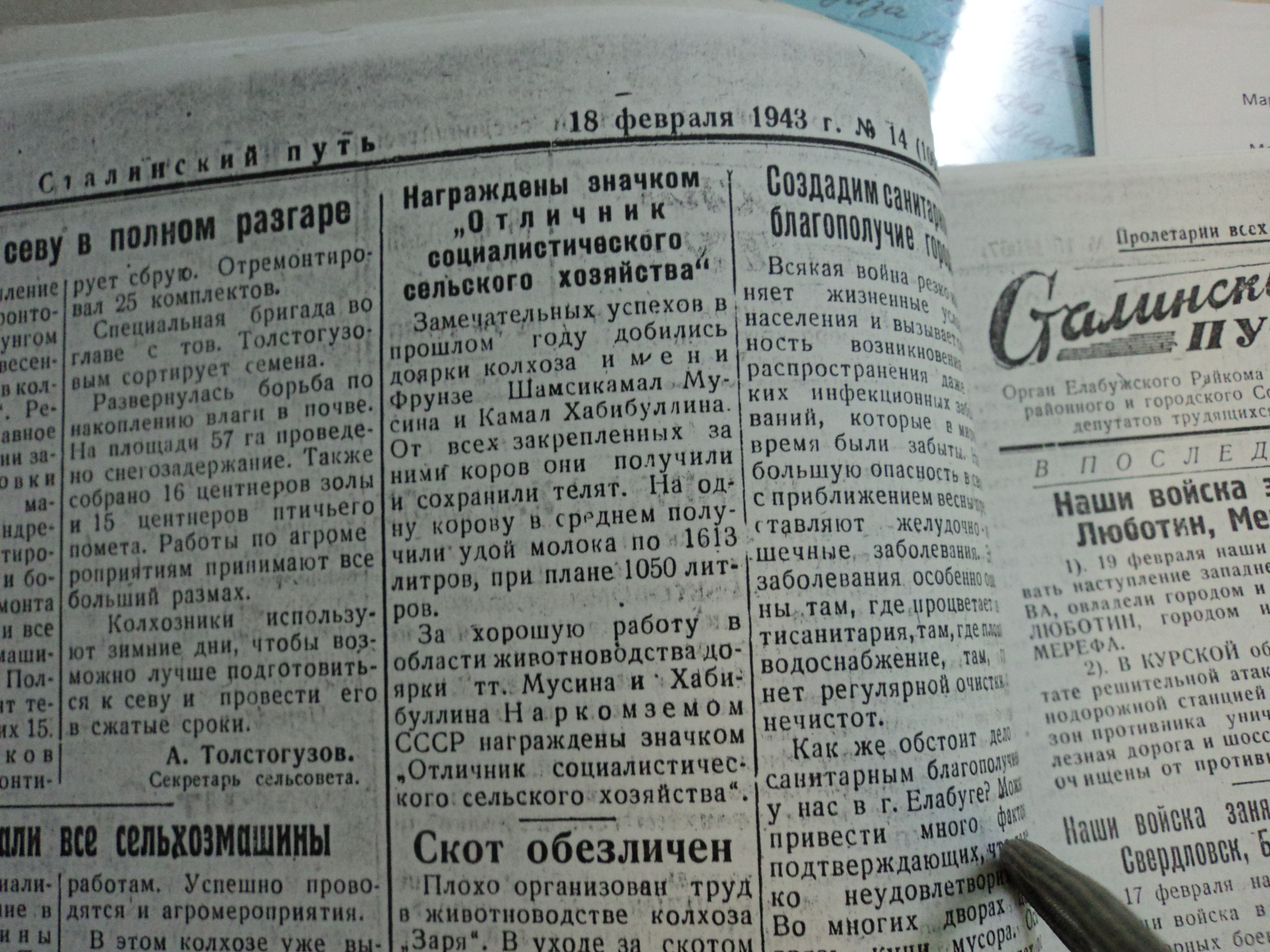 Доярка колхоза имени Фрунзе (Ядыгар), награждена знаком отличия народного комиссариата земледелия СССР «Отличник социалистического сельского хозяйства НКЗ СССР» ( февраль1943 г.).