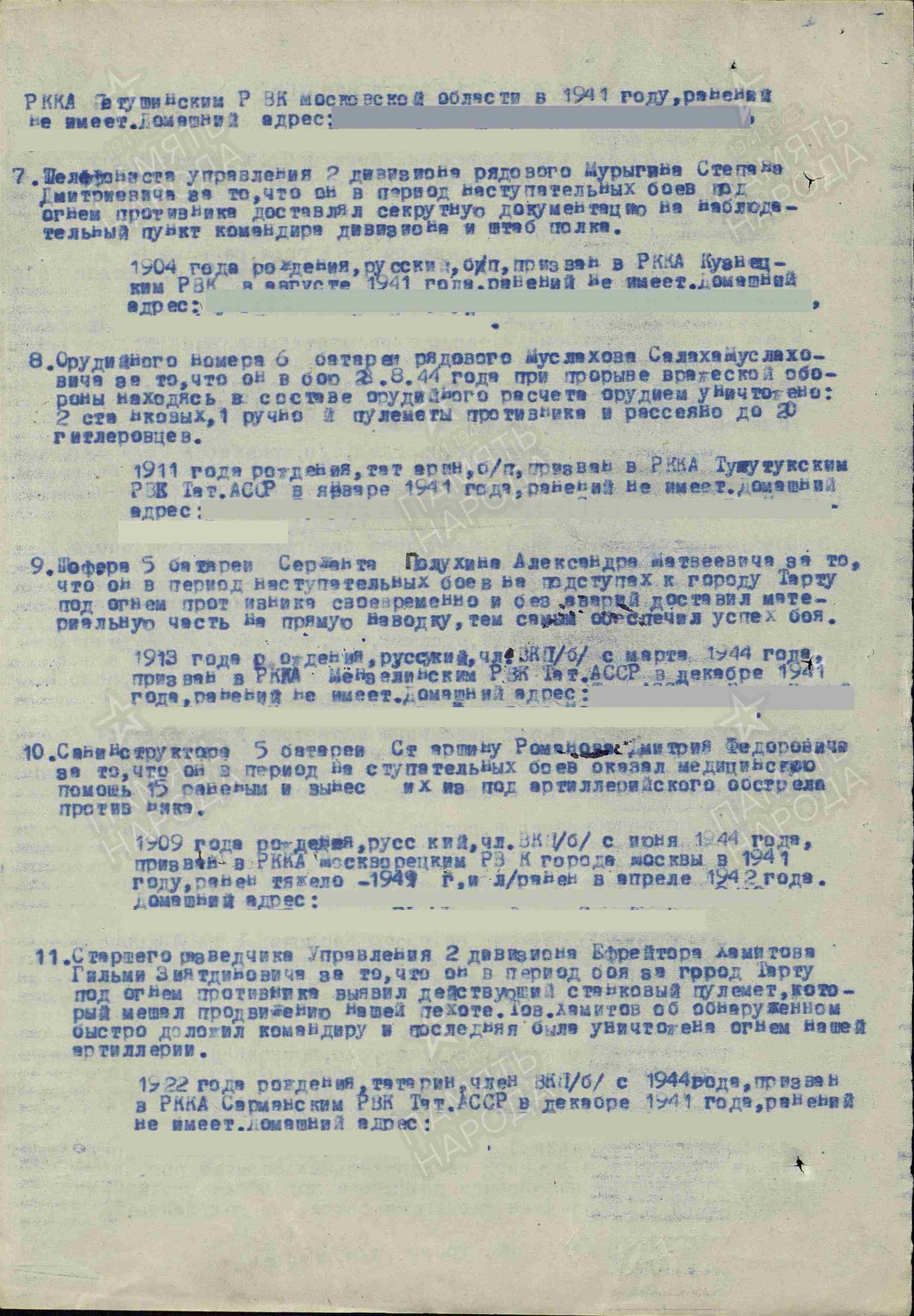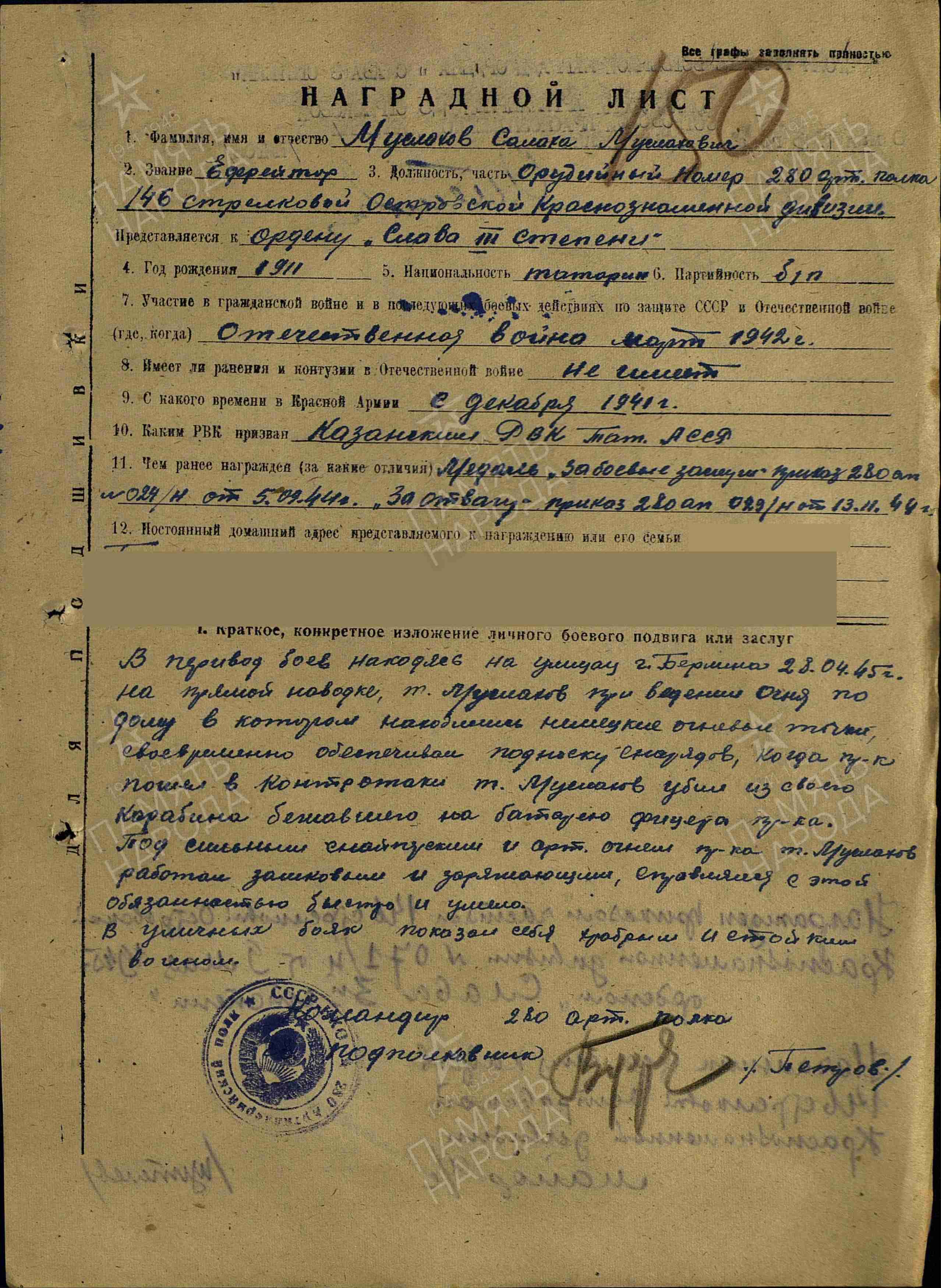 Муслахов Салах Муслахович был мобилизован в 1941 году. Прошел войну от начала до конца. Был награжден множественными медалями за отвагу, за взятие берлина, орденами славы 2 и 3 степени