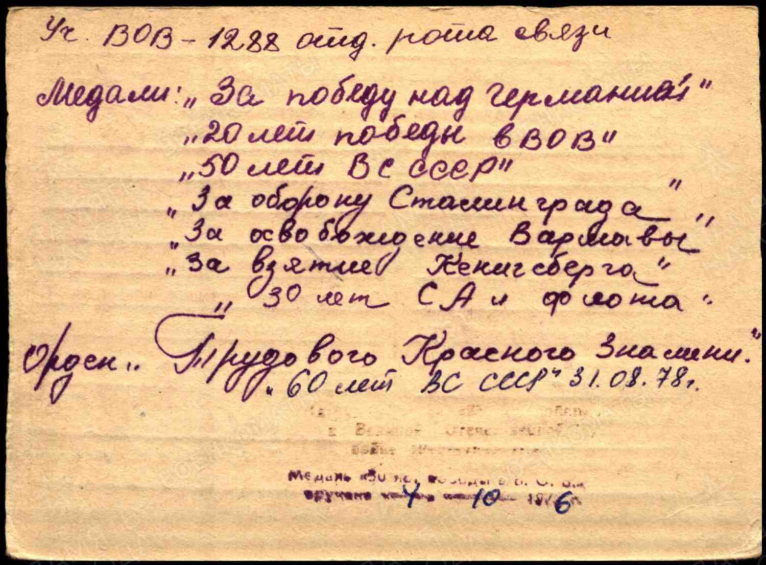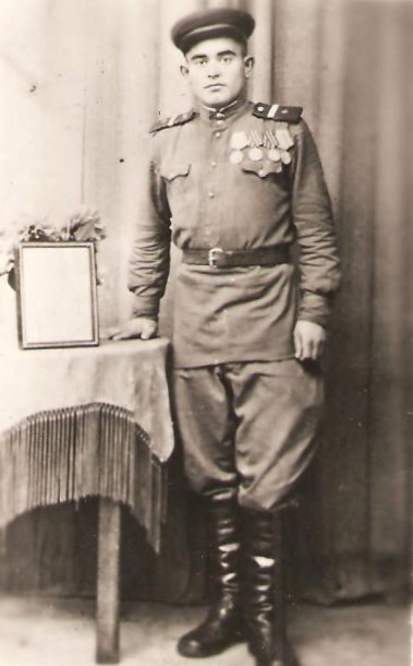 Призван в армию 12.1942 г Шугуровским РВК. В действующей армии с 01.1943 по 05.1945 года. Воинское звание: ефрейтор, в должности линейного надсмотрщика правительственной связи. Принимал участие в крупных сражениях под Сталинградом, Варшавой, штурмовал Кенигсберг, Берлин.