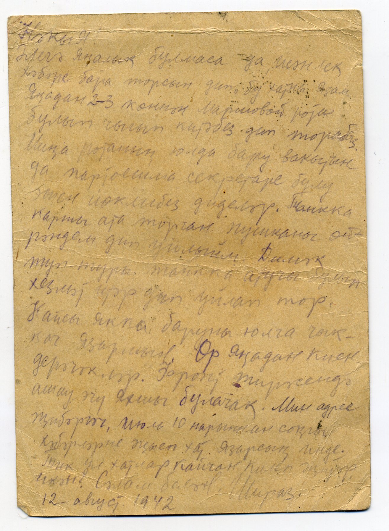 Шираз Мухутдинович родился в 1900 г. в д. Кук-Тяка Бугульминского уезда Самарской губернии (позже Тумутукский район ТатАССР, сейчас Азнакаевский район РТ). Участник Гражданской войны. Мобилизован 12 апреля 1942 года Азнакаевским РВК ТатАССР. Красноармеец 123 стрелковой бригады, наводчик ПТО (полевая почта 1768 - 911 арт. полк 340 СД). Погиб 28 января 1943 года при прорыве блокады г. Ленинград. Похоронен около рабочего поселка № 2 Ленинградской области. Последнее письмо (9 февраля 1943) от жены вернулось в Азнакаево с пометкой "адресат выбыл в неизвестном направлении".