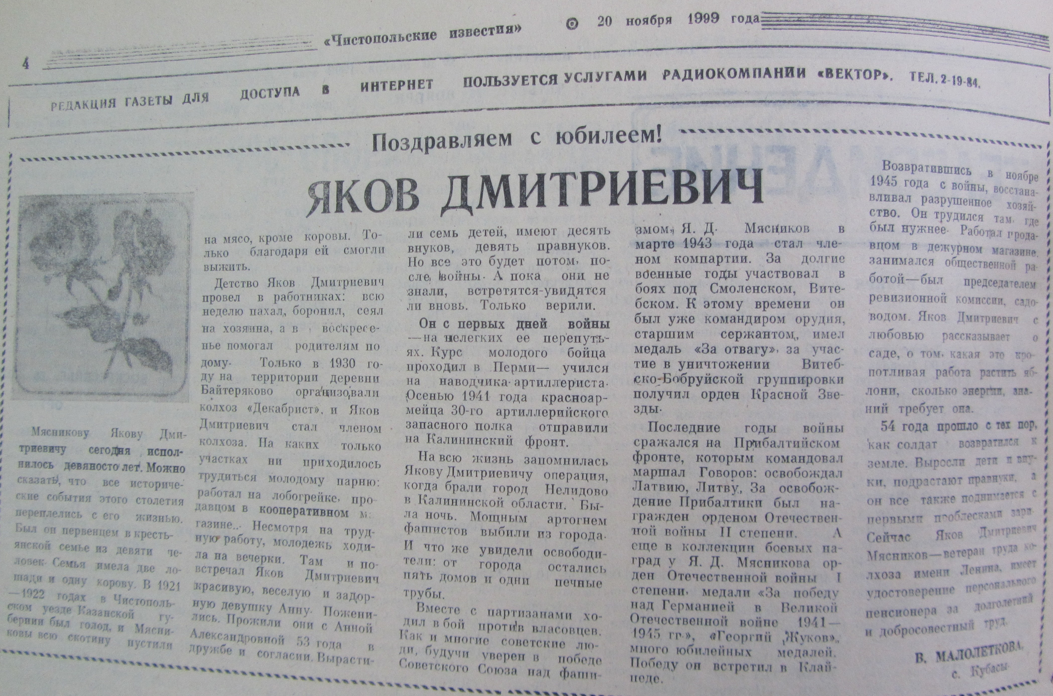 Фонды Чистопольского музея-заповедника: В. Малолеткова. Поздравляем с юбилеем! Яков Дмитриевич // Чистопольские Известия. 20 ноября 1999. С.4