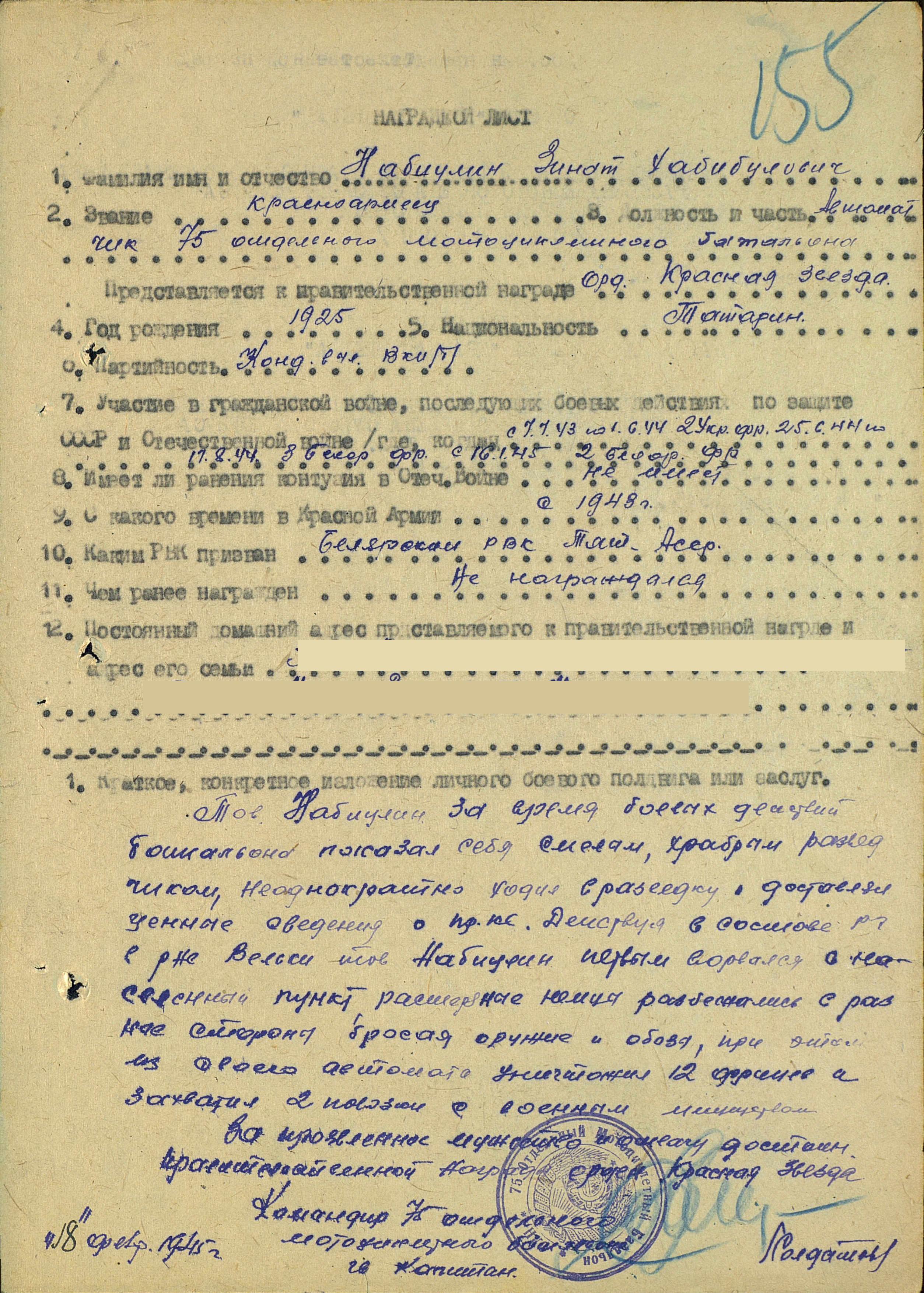 НАБИУЛЛИН Зиннатулла Хабибуллович, 1925, с. Большие Тиганы. Мобилизован Билярским РВК в 1943 г. На фронте с 7 июля 1943 г. Воевал на 2 Украинском, 2 и 3 Белорусском фронтах. Красноармеец, автоматчик, разведчик 75 отдельного мотоциклетного батальона 29 Танкового Корпуса. Героически проявил себя в бою за н.п. Вельки в феврале 1945 г.: первым ворвался в нас. пункт, уничтожил 12 вражеских солдат, захватил 2 повозки с военным имуществом. Награждён орденом Красной Звезды, орденом Отечественной войны 1 ст. (1985), медалью "За победу над Германией". Демобилизован в 1950 г. Работал в Казанском Доме печати, полиграфист. Скончался в 1999 г., похоронен в г. Казань.