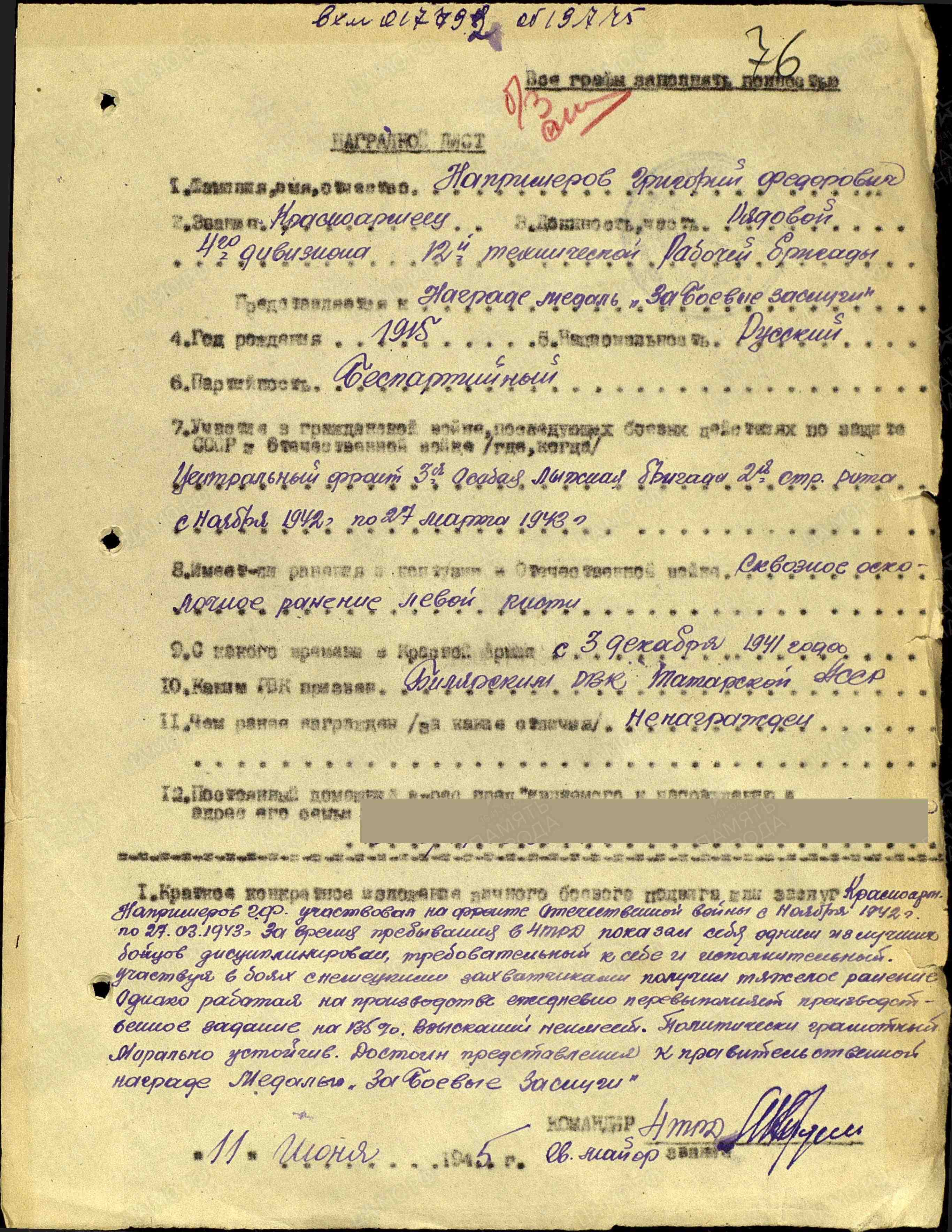 НАПРИМЕРОВ Григорий Фёдорович, 1915, д. Берёзовка. Мобилизован 3 дек. 1941 Билярским РВК. Красноармеец, стрелок 3 отд. лыжной бригады 27 А Северо-Западного фронта. 27 марта 1943 получил сквозное осколочное ранение левой кисти. После излечения в госпитале зачислен в состав 12 технической рабочей бригады. Несмотря на тяжёлое ранение ежедневно выполнял задания командования на 135%. Награждён медалью «За боевые заслуги» (1946).