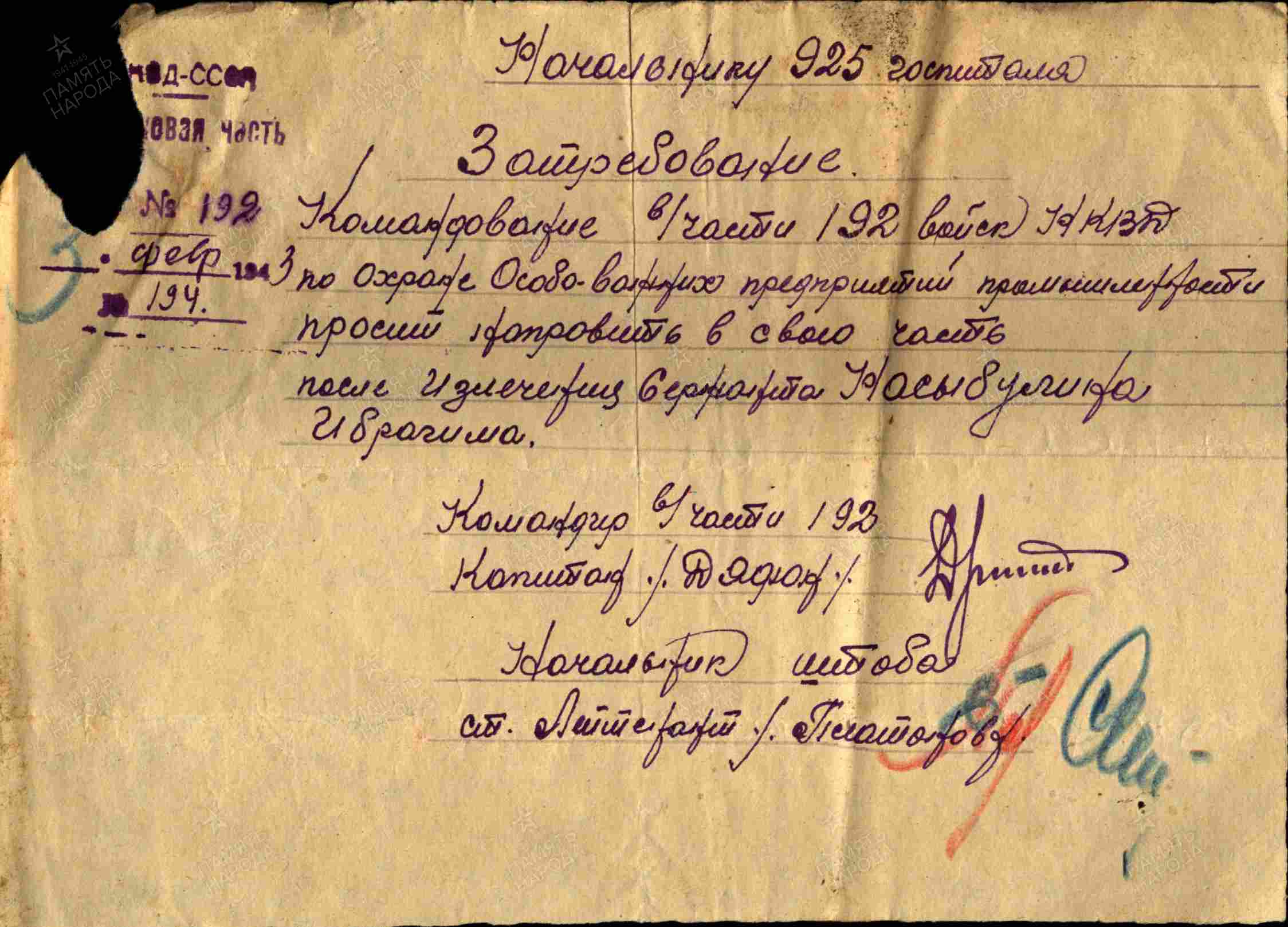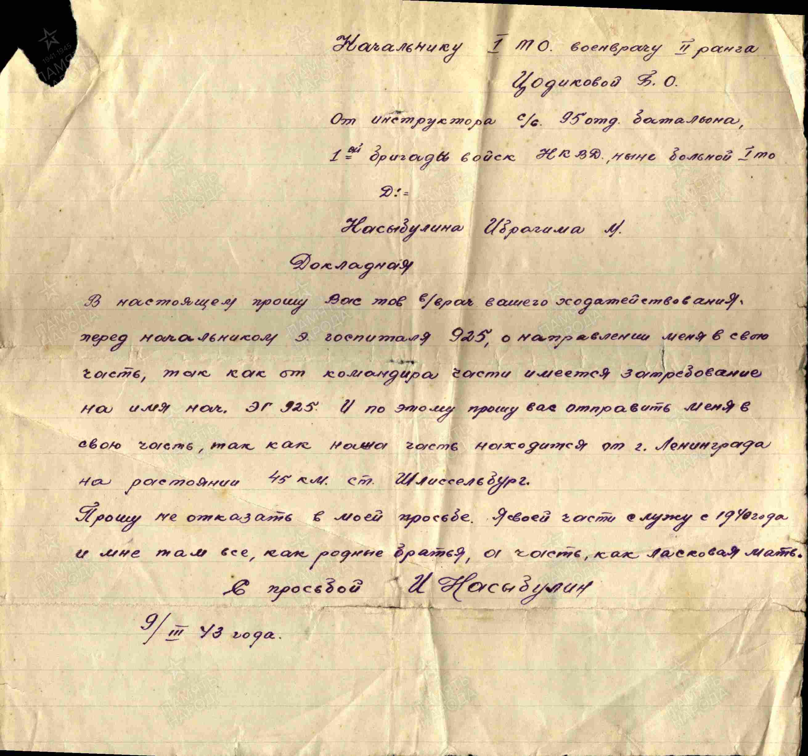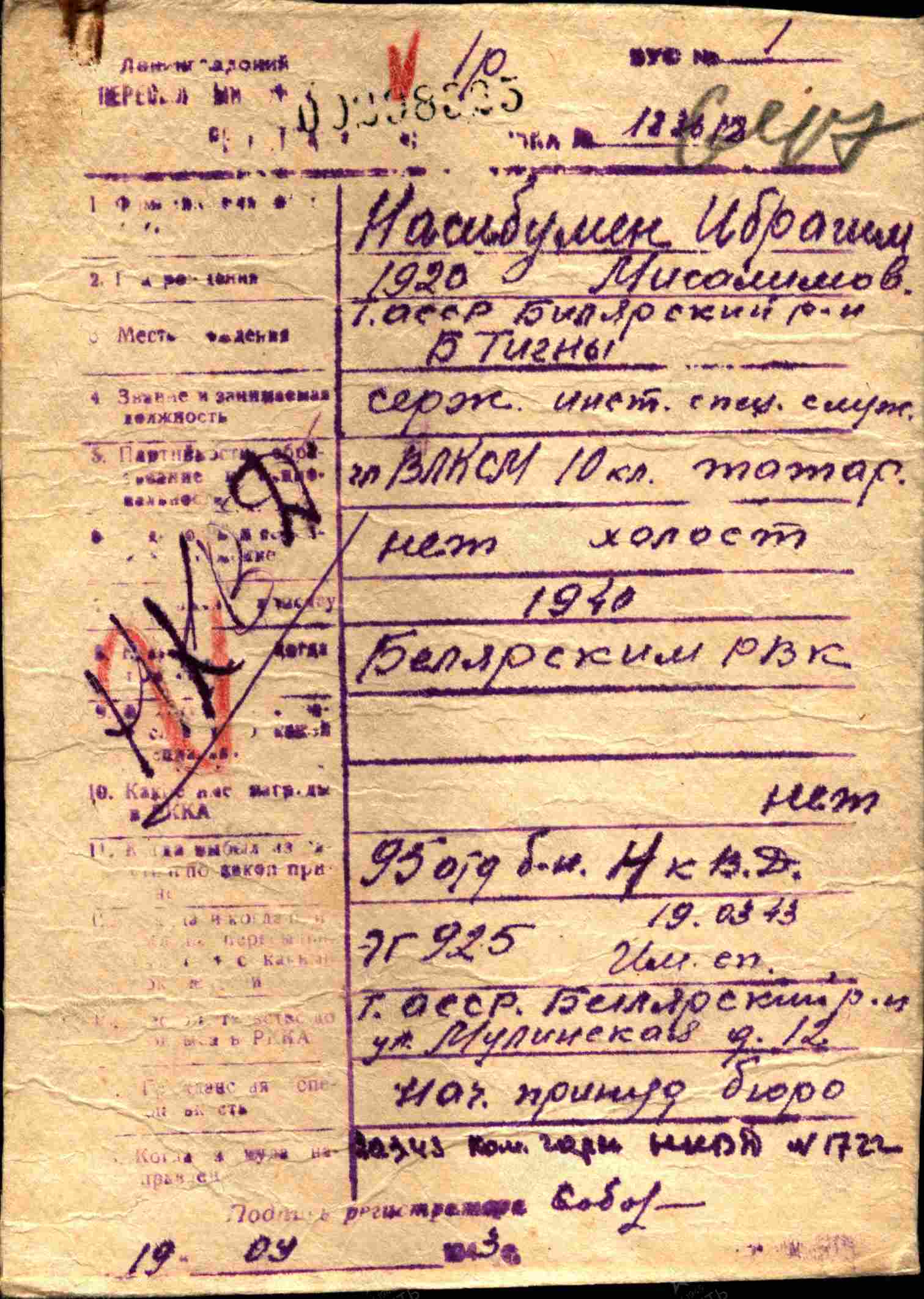 НАСЫБУЛЛИН Ибрагим Мисалимович, 1920, с. Большие Тиганы. Член ВЛКСМ. Призван Билярским РВК 26 сент. 1940. Мл. сержант/ сержант административной службы, Объединённая школа мл. инструкторов спец. служб НКВД Московской зоны обороны; 95 отд. батальон по охране особо важных предприятий промышленности и железных дорог 1 Бр войск НКВД Ленинградского фронта; зав. складом батальона/ инструктор служебных собак/ ВРИД пом. нач. штаба 215 пограничного полка войск НКВД по службе собак, 4 Украинский фронт. Перенёс контузию в ходе боёв по прорыву блокады Ленинграда в 1943. Проходил лечение в ЭГ 925, г. Ленинград. Участвуя в службе охраны тыла действующей армии задержал 18 преступных элементов. Награждён медалями «За оборону Ленинграда», «За оборону Москвы», «За боевые заслуги».