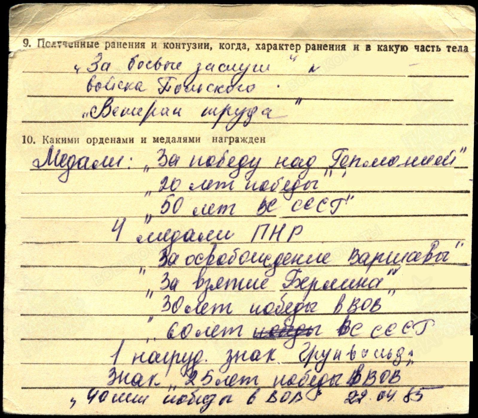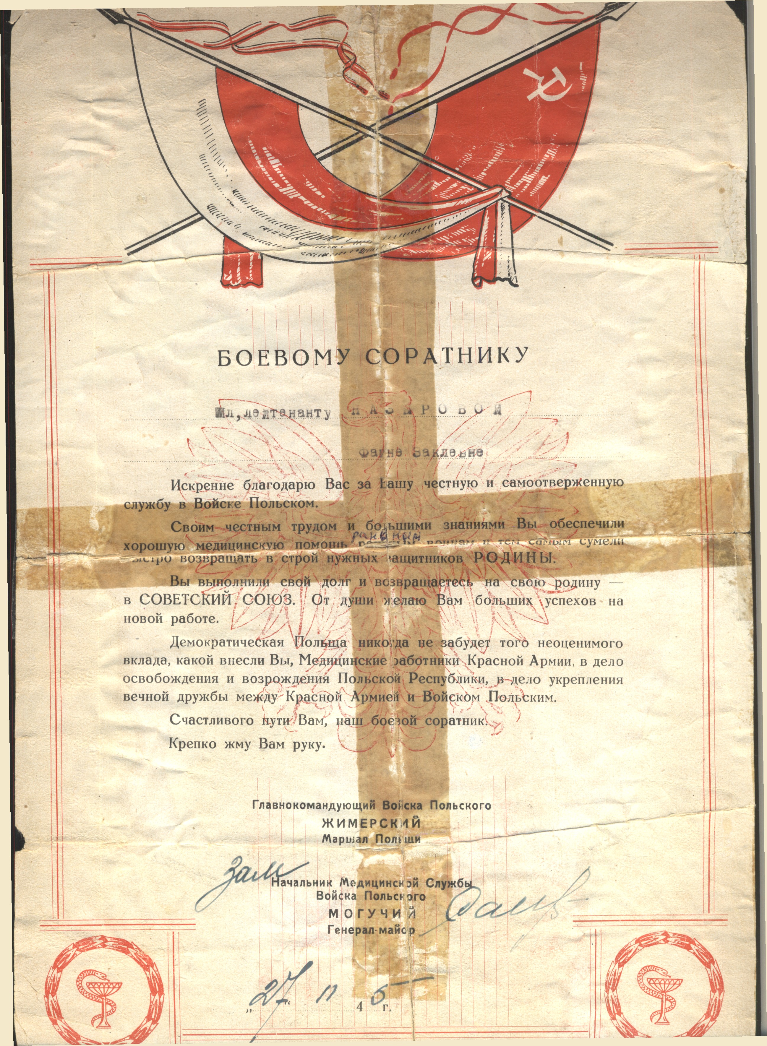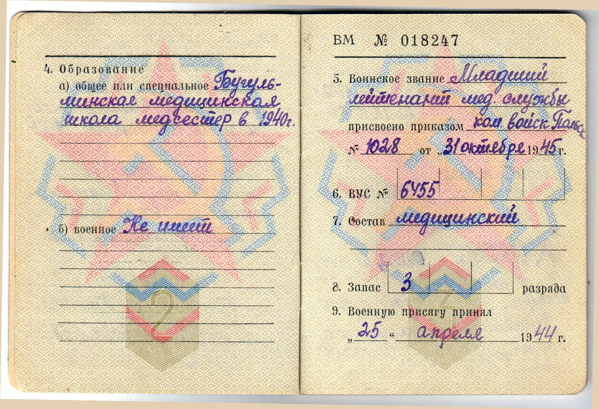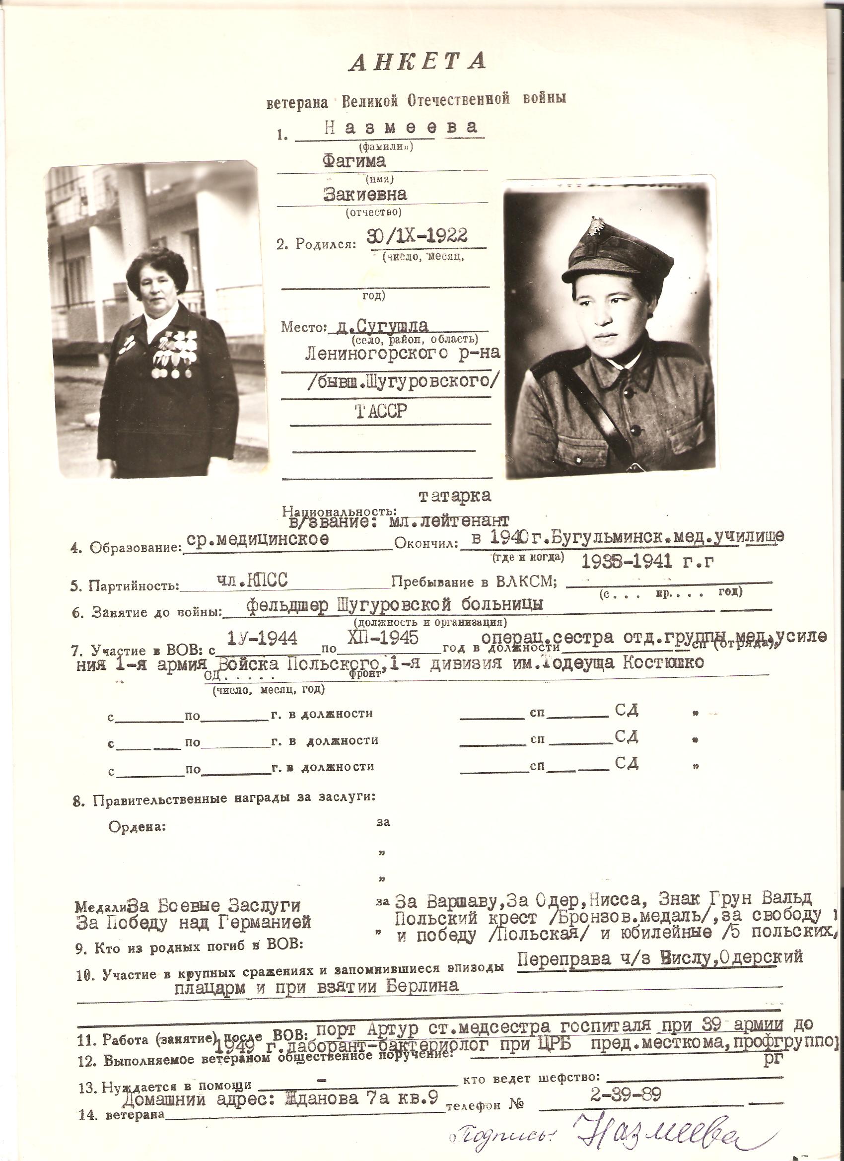 с 04. 1944 по 12.1945 г. старшая операционная сестра 1 армия Войска Польского (1 А ВП)1. Воинское звание мл. лейтенант мед. сл.