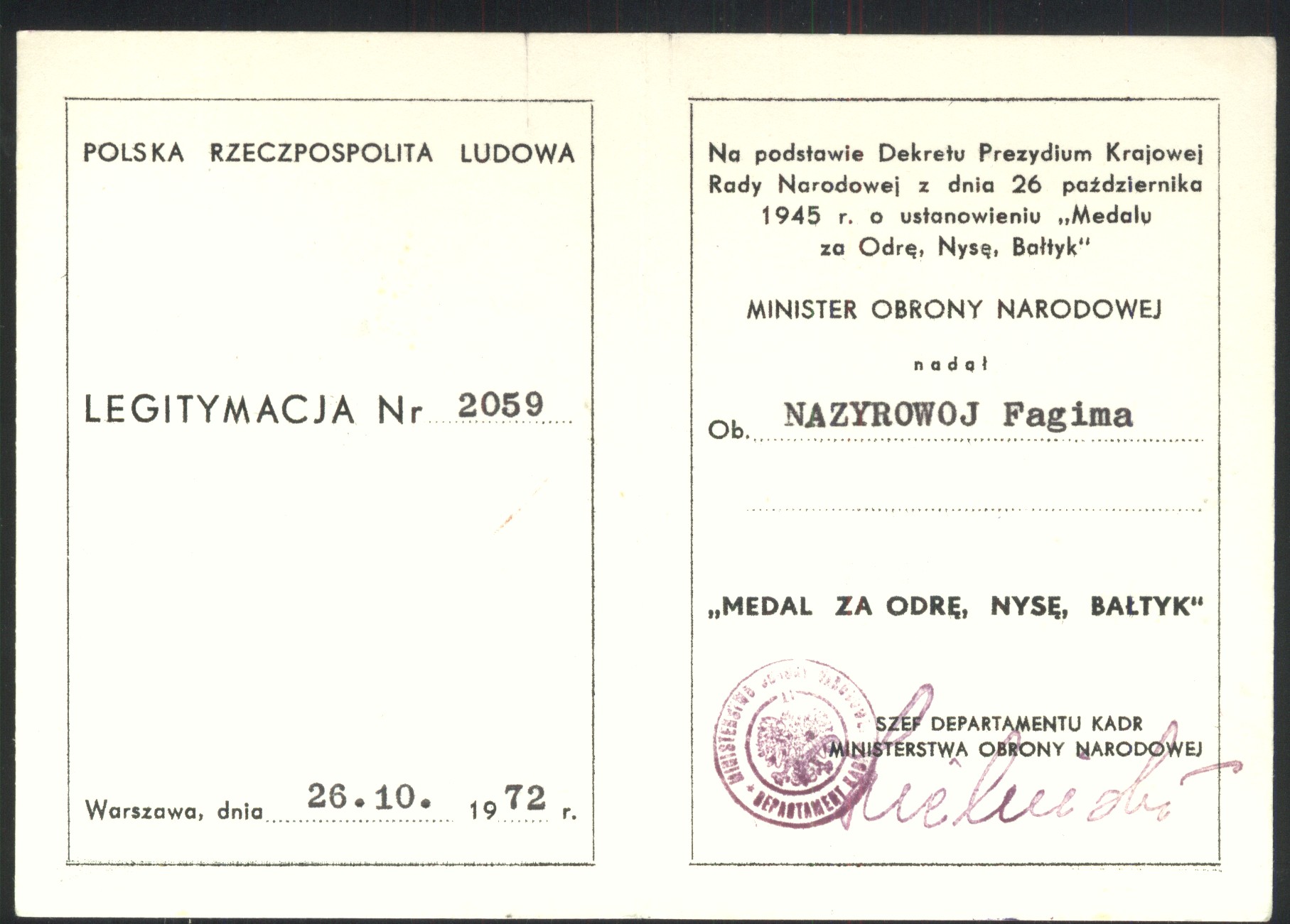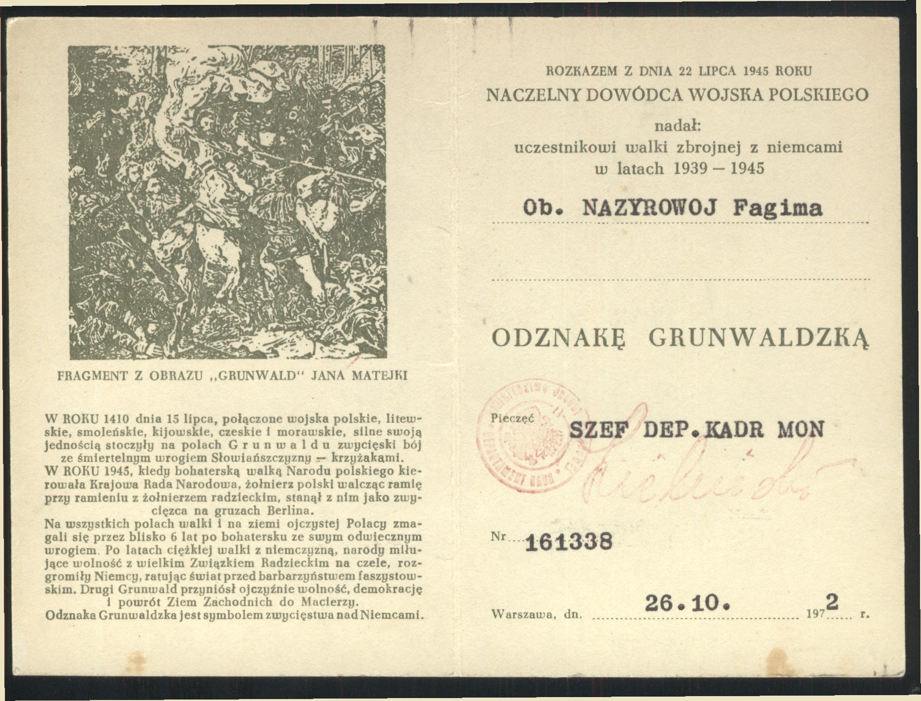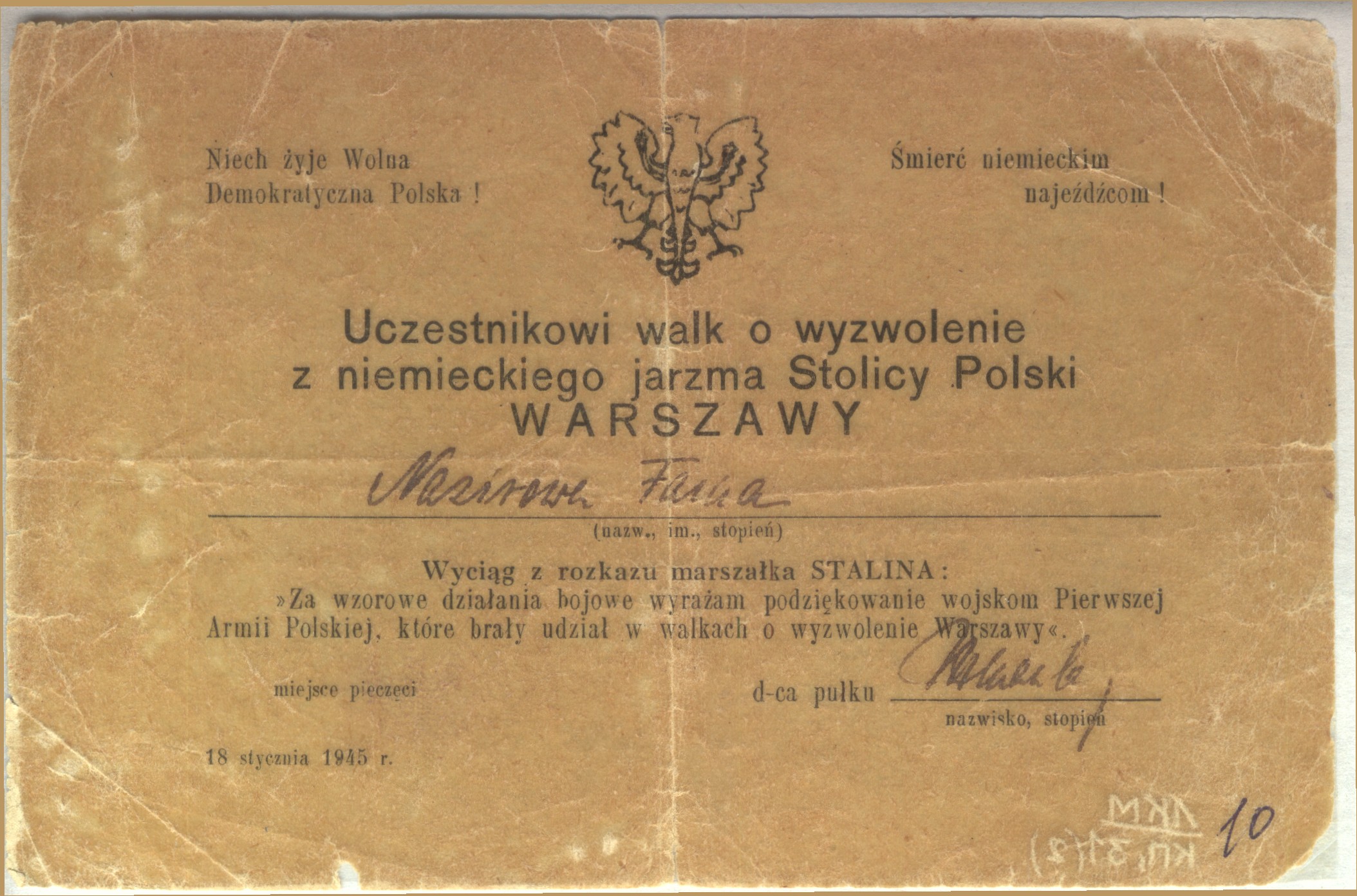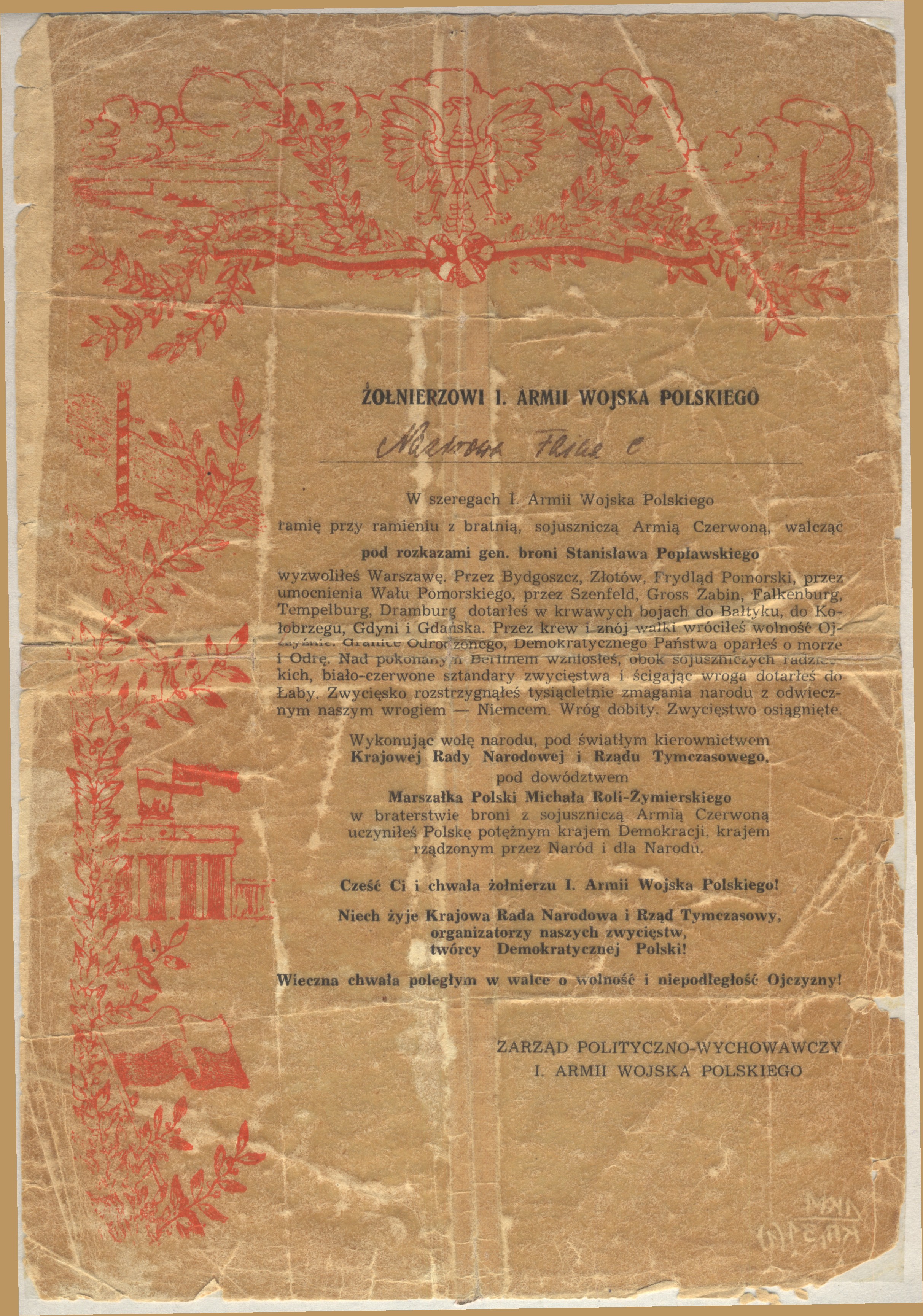 с 04. 1944 по 12.1945 г. старшая операционная сестра 1 армия Войска Польского (1 А ВП)1. Воинское звание мл. лейтенант мед. сл.