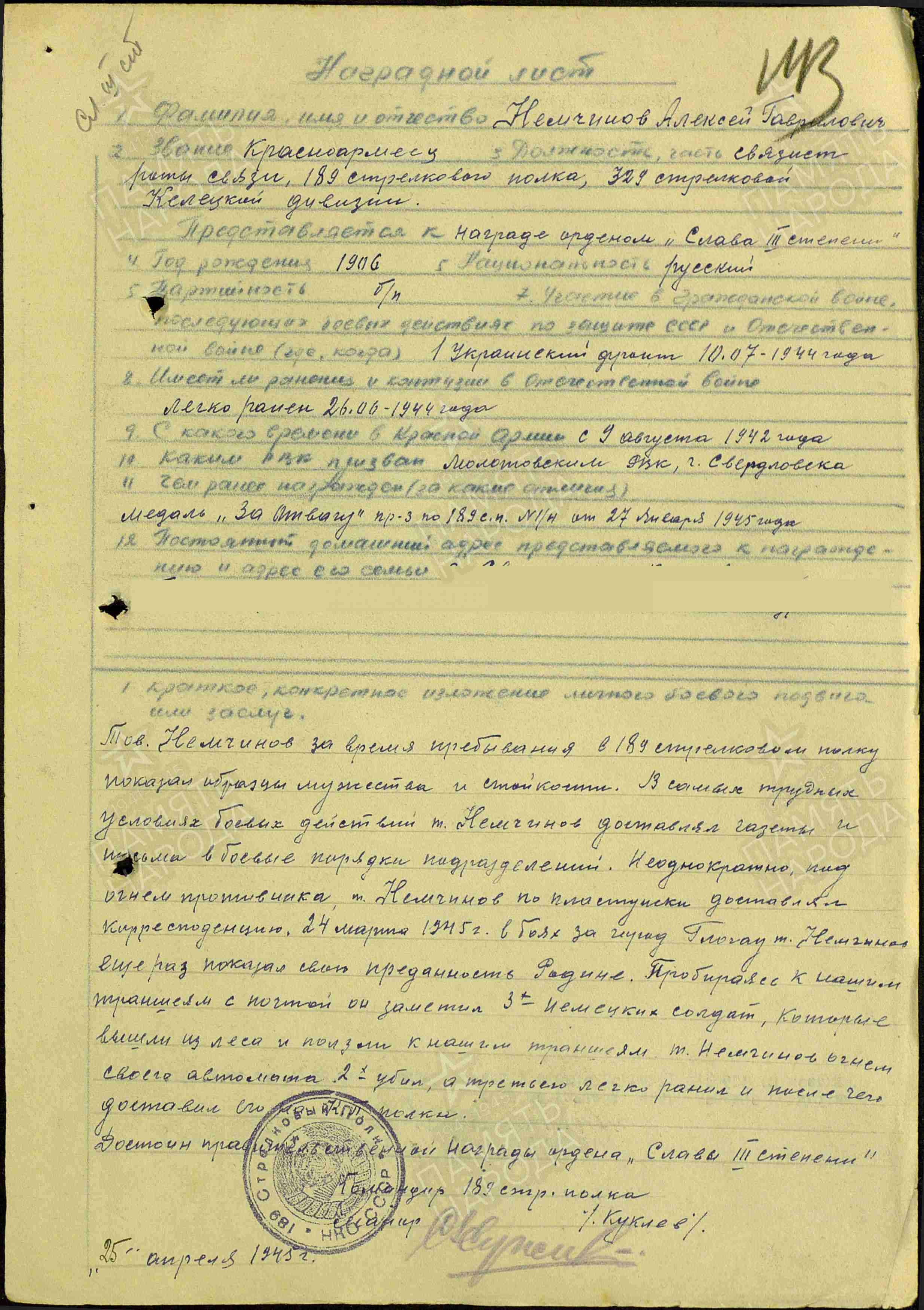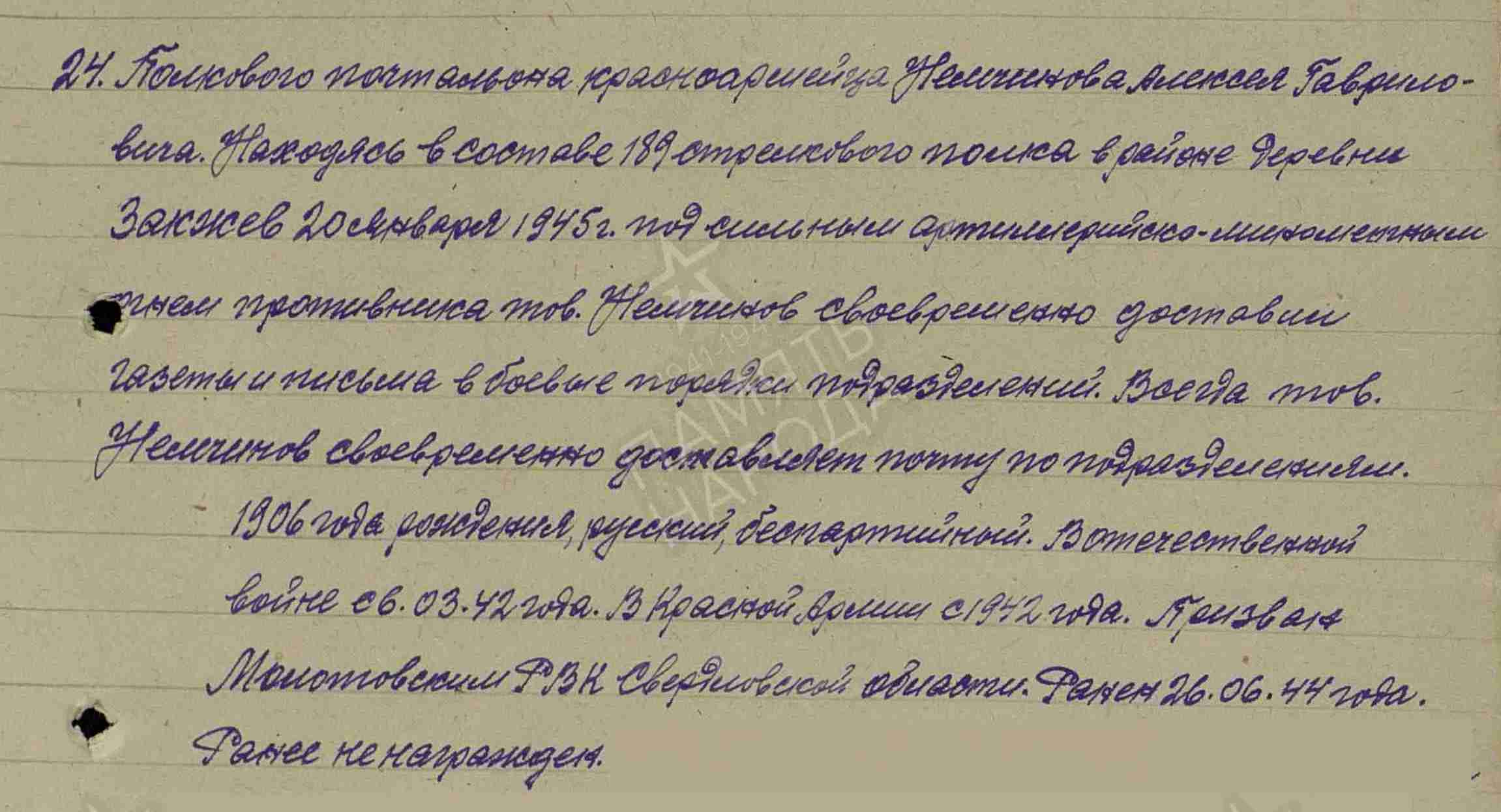 НЕМЧИНОВ Алексей Гаврилович, 1906, с. Билярск. Мобилизован Молотовским РВК г. Свердловск 9 авг. 1942. Красноармеец/ мл. сержант, 189 СП 329 СД 22 СК 3 гв. А 1 УкрФ. 26 июня 1944 был ранен. В 1945 – связист, почтальон ППС 1929. Самоотверженно доставлял под арт. мин. огнём письма и газеты в боевые порядки полка. 24 марта 1945, в боях за г. Глогау, пробираясь с своим траншеям с почтовой корреспонденцией, заметил трёх немцев, огнём автомата убил двоих, одного легко ранил, пленил и доставил на КП полка. Награждён медалью «За отвагу», орденом Славы 3 ст.