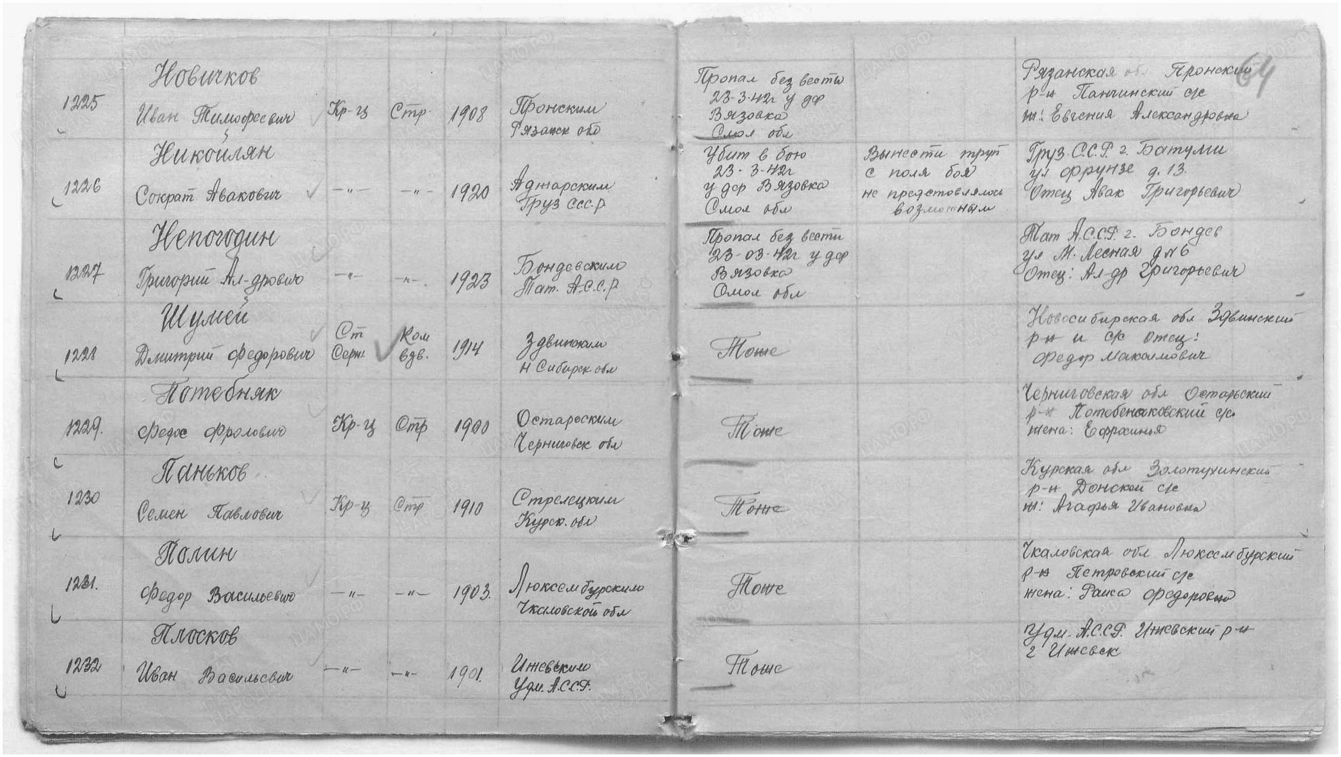 Мобилизован Бондюжским райвоенкоматом. Бондюжский р-н Последнее место службы ( 256 сд ) Дата выбытия 23.03.1942 Причина выбытия пропал без вести Место выбытия Смоленская обл., Сычевский р-н, д. Вязовка,