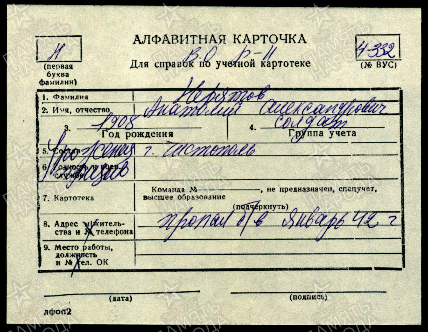 Анатолий Александрович Нерятов родился в 1908 г. в г.Чистополе, ТАССР. В 1941 г. призван в ряды Красной Армии военным комиссариатом. Участвовал в боях за оборону Ленинграда, в январе 1942 г. пропал без вести.